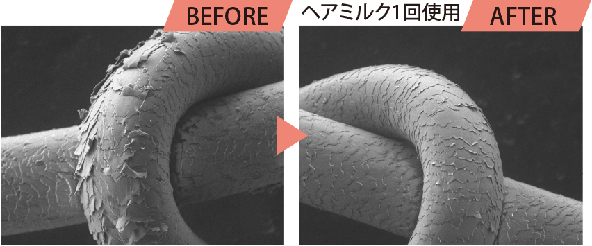 エイジングした髪はキューティクルが浮き、乾燥状態。ツヤが失われて、湿度の変化や静電気による影響を受けやすくうねってしまいます。ヘアミルクを1回使用すると、キューティクルがキュッと閉じてなめらかに整いツヤもアップ!