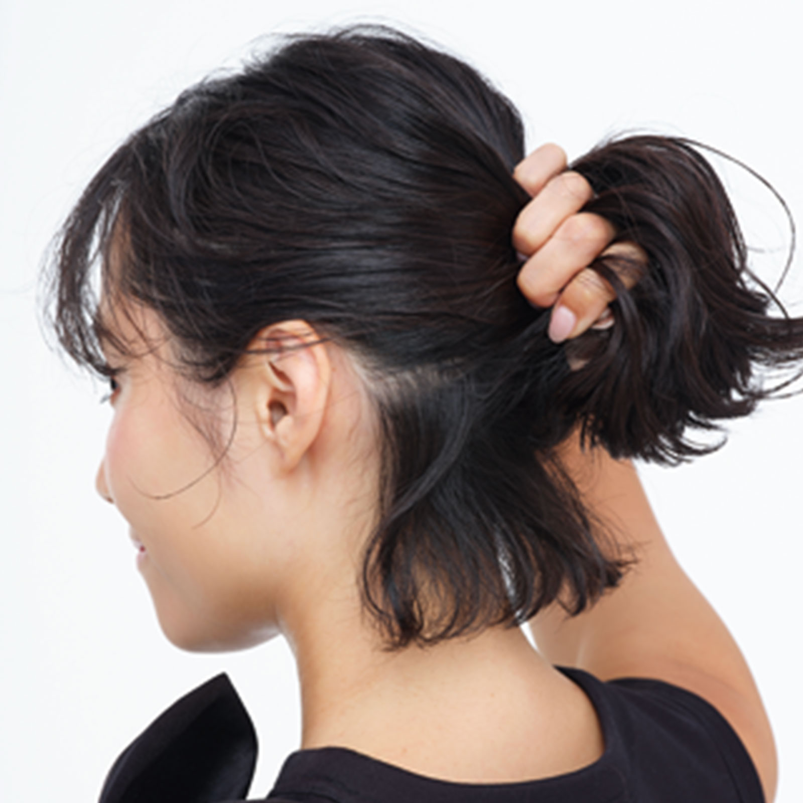 1.ワックスを手になじませ、手ぐしで耳後ろにまとめる。
