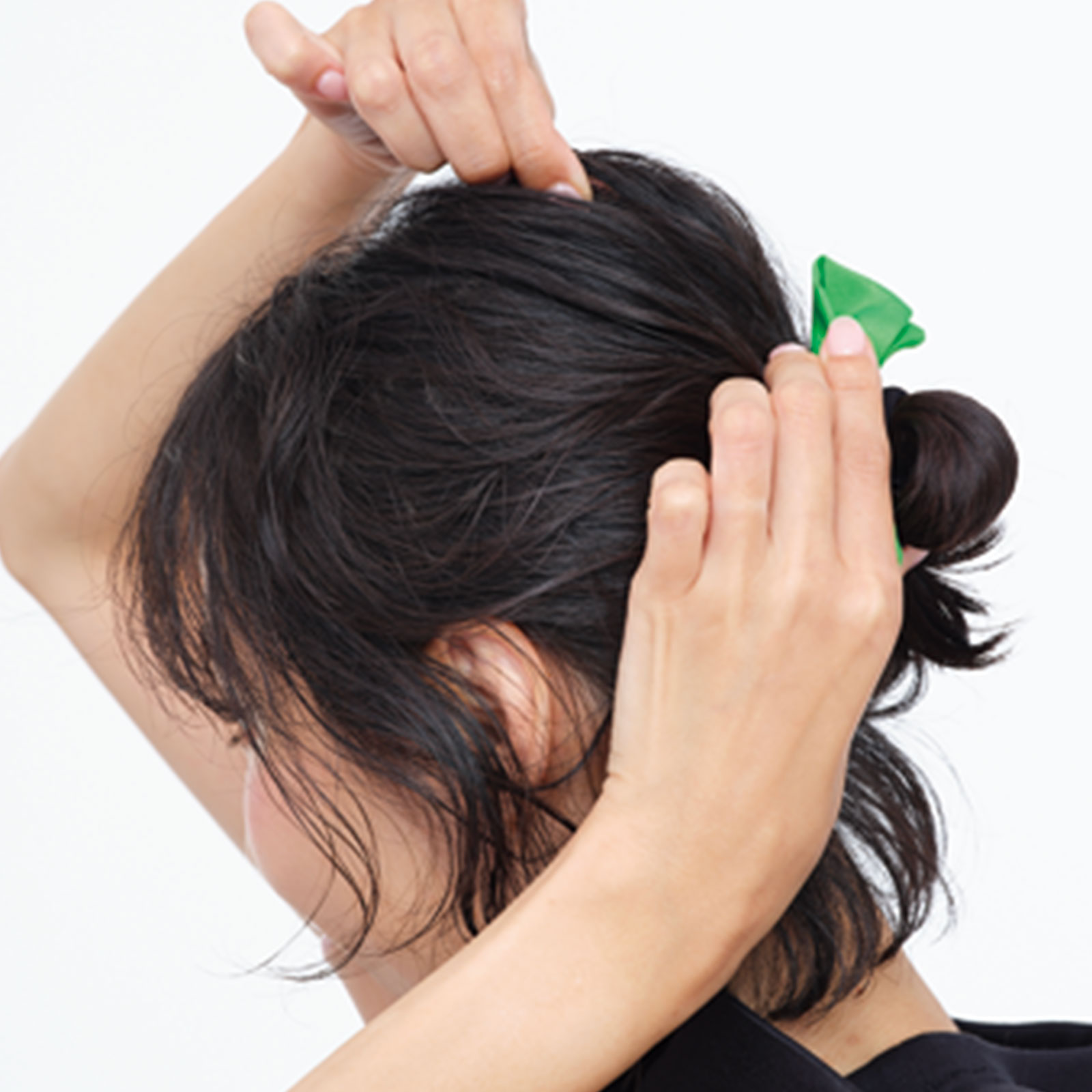 2.ゴムで結びまとめた部分を内側にふたつ折りにする。