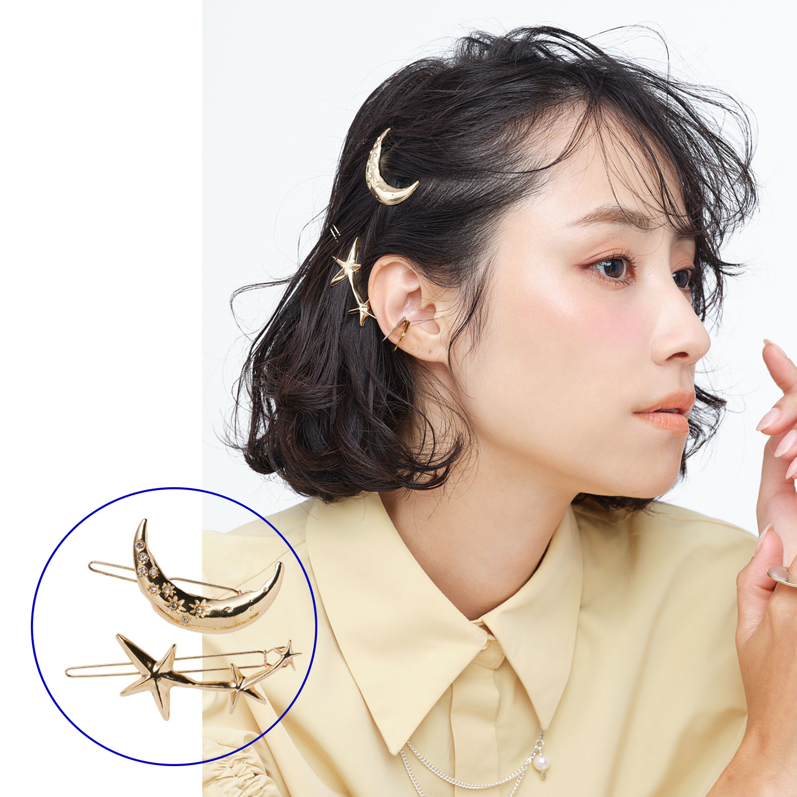 顔周りをスッキリ見せ、小顔効果も叶うサイドピンアレンジ。月にあしらわれたクリスタルが頰を明るく照らします。