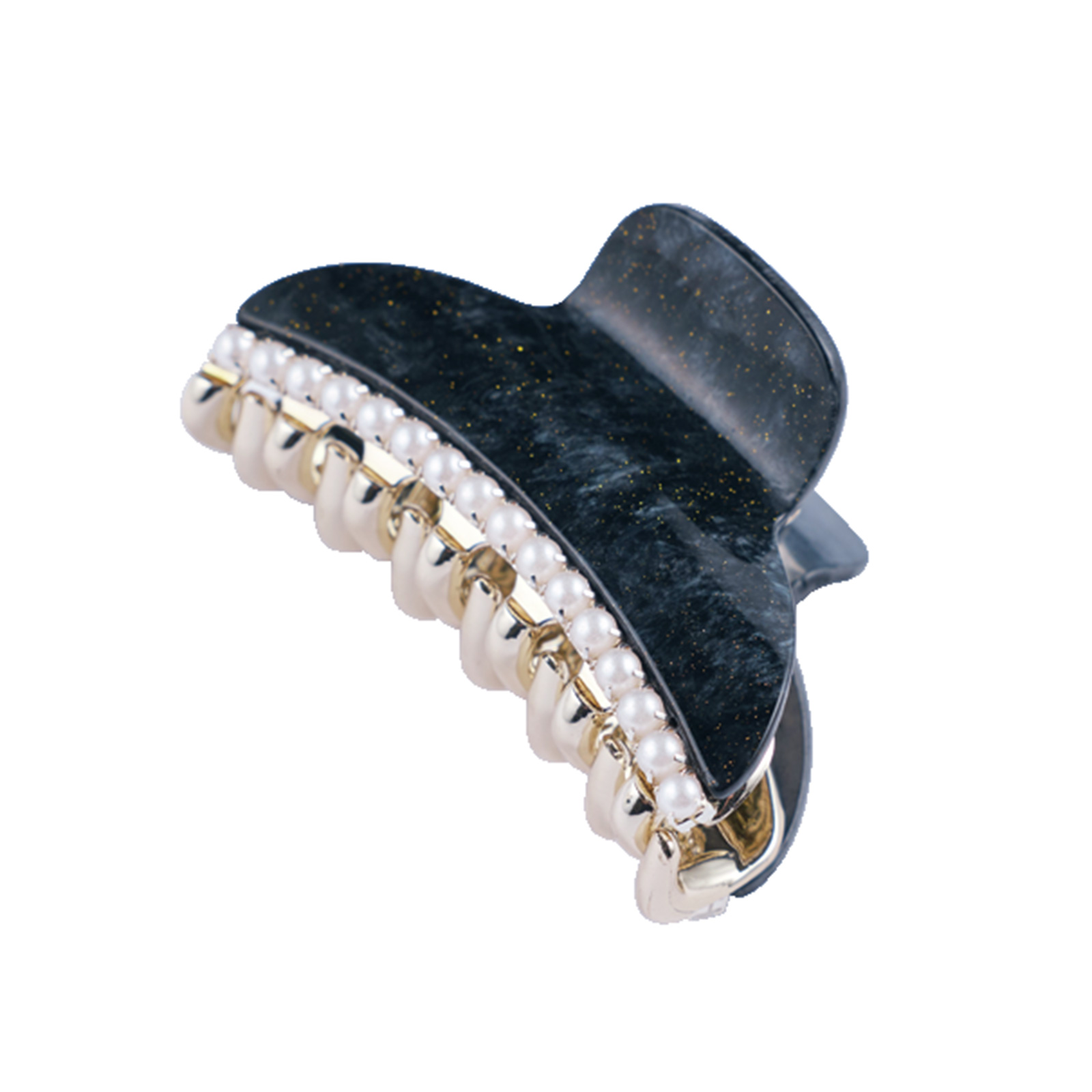 並んでセットされているパールは小ぶりですが、髪につけるとよく映えます。黒×パールクリップ¥1,210(MUK)