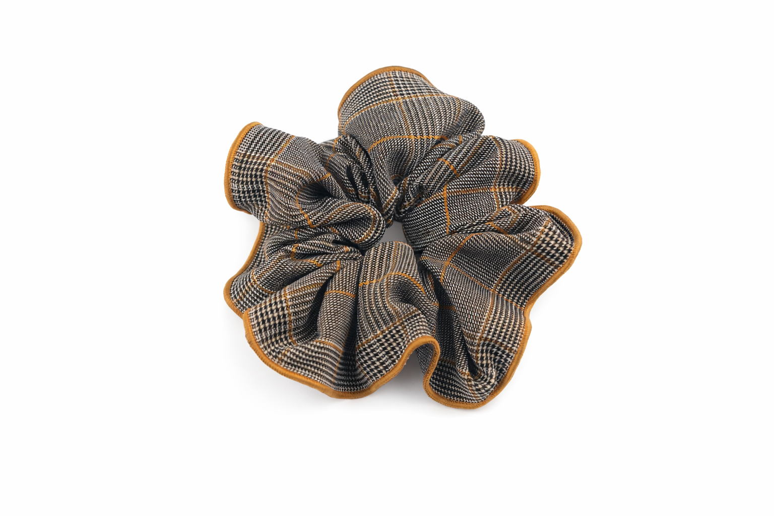 甘いイメージがあるシュシュですが、マニッシュに仕上げたいならチェック柄を。チェックシュシュ¥1,430(dee doo dah/アジュールスカイ)