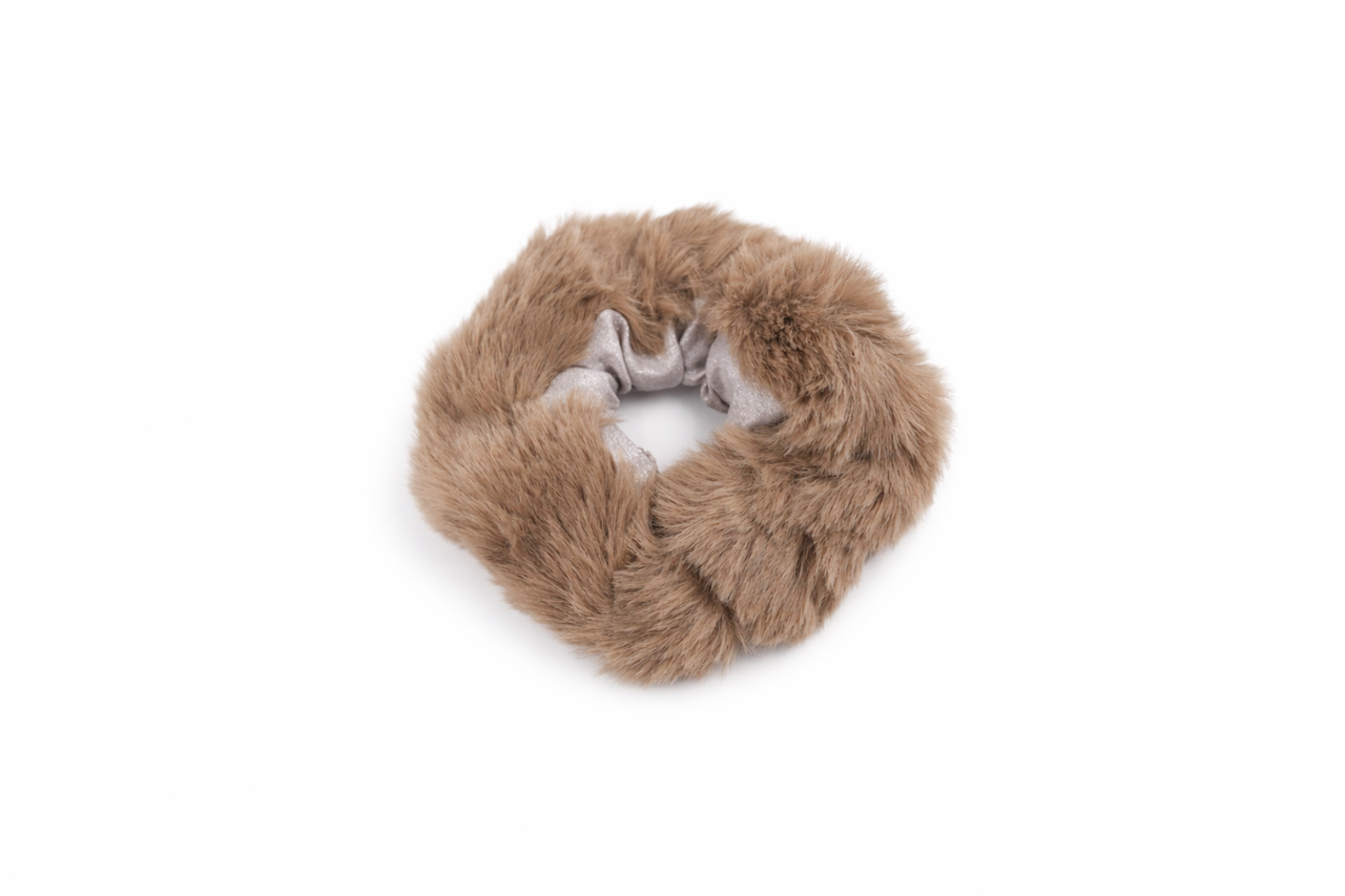 ラフなゴムシニヨンがエレガントに仕上がる、サテンとファーを組み合わせたシュシュ。サテンファービッグシュシュ¥1,430(MUK)