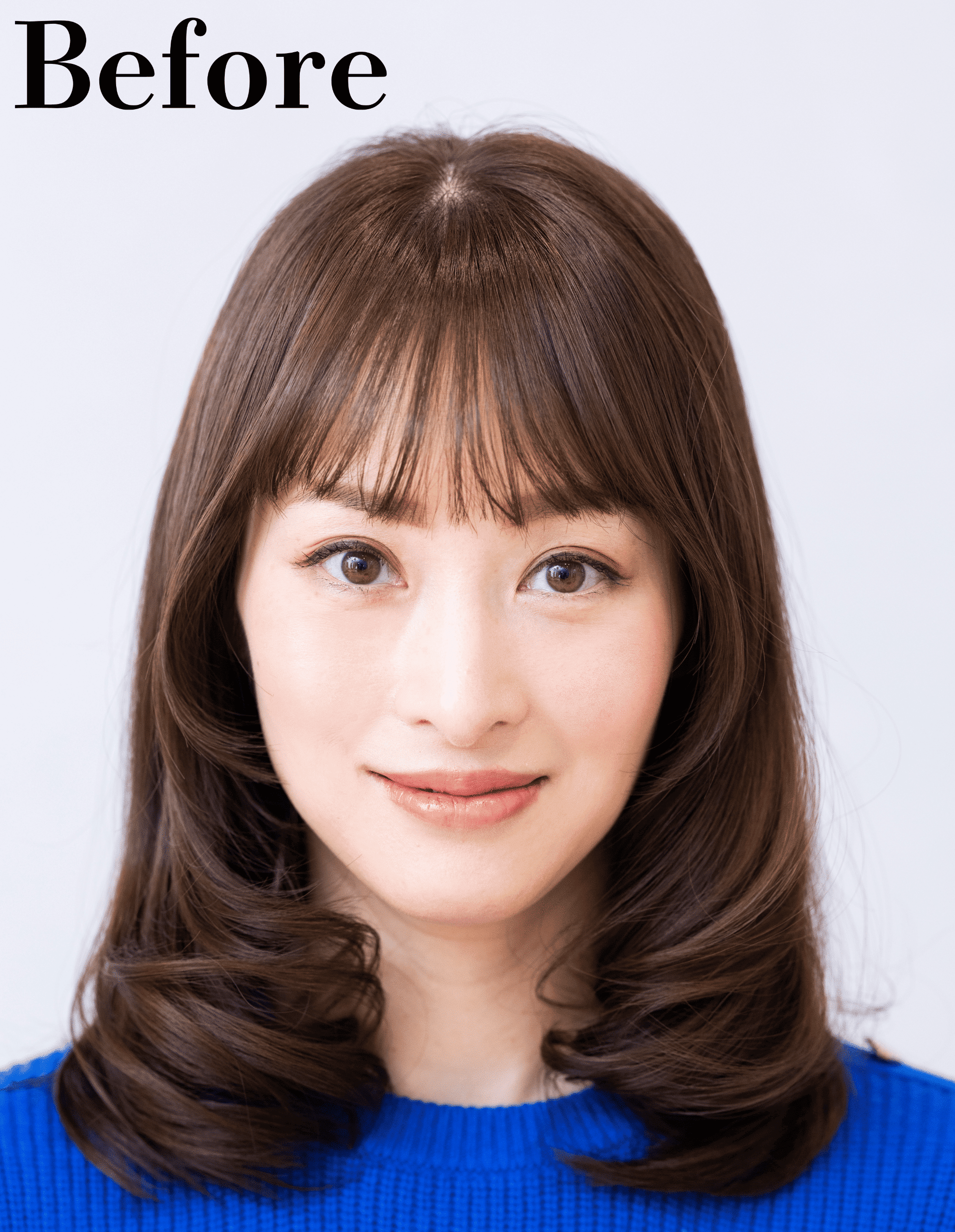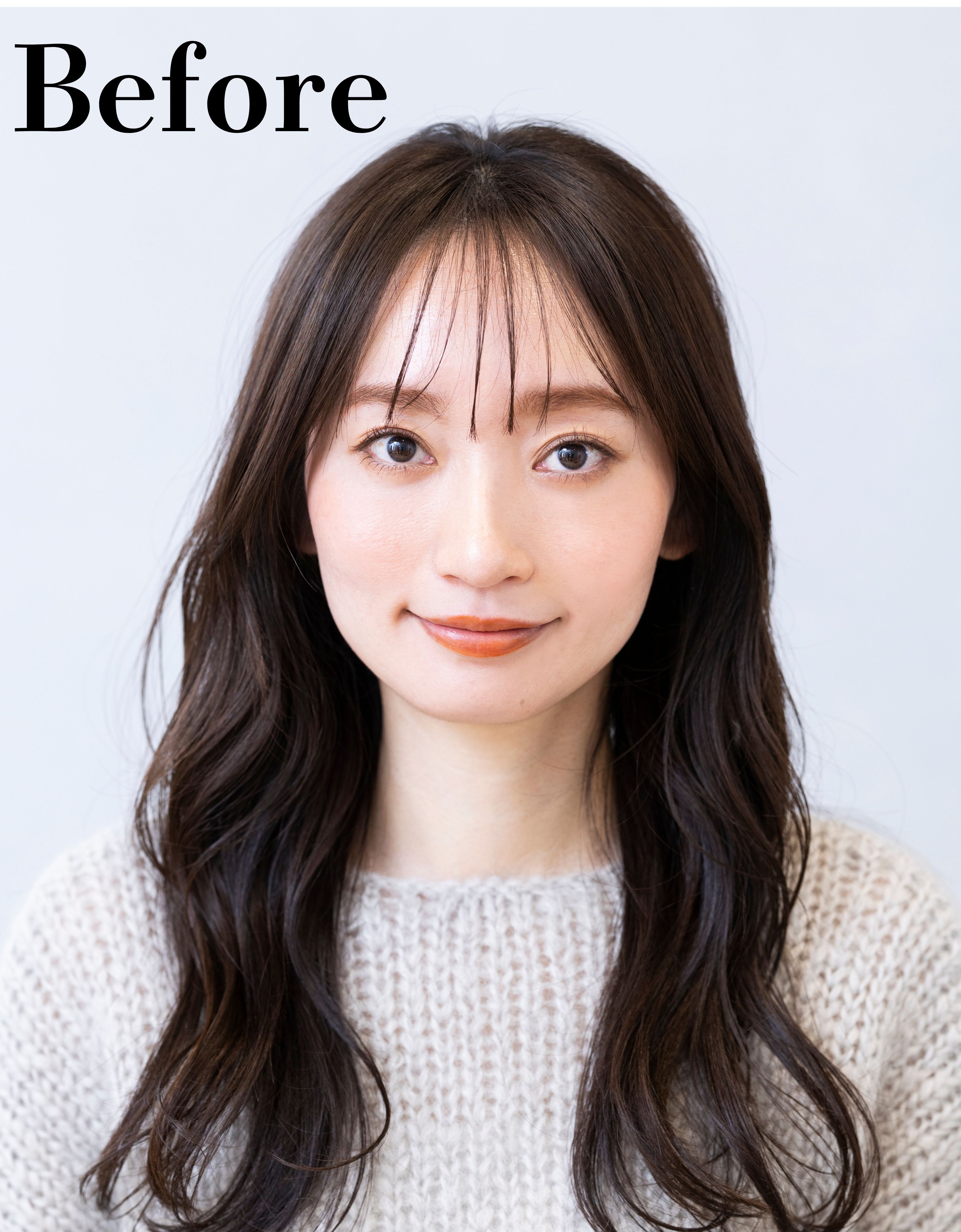〈カット〉頬上くらいの長めの前髪をカットします。毛先はサイドに流れるように毛量調節して軽さを出します。短めの前髪があっても量が少なければ長めの前髪と一緒になじませられます。全体の髪の長さはどんな長さでも大丈夫です。
