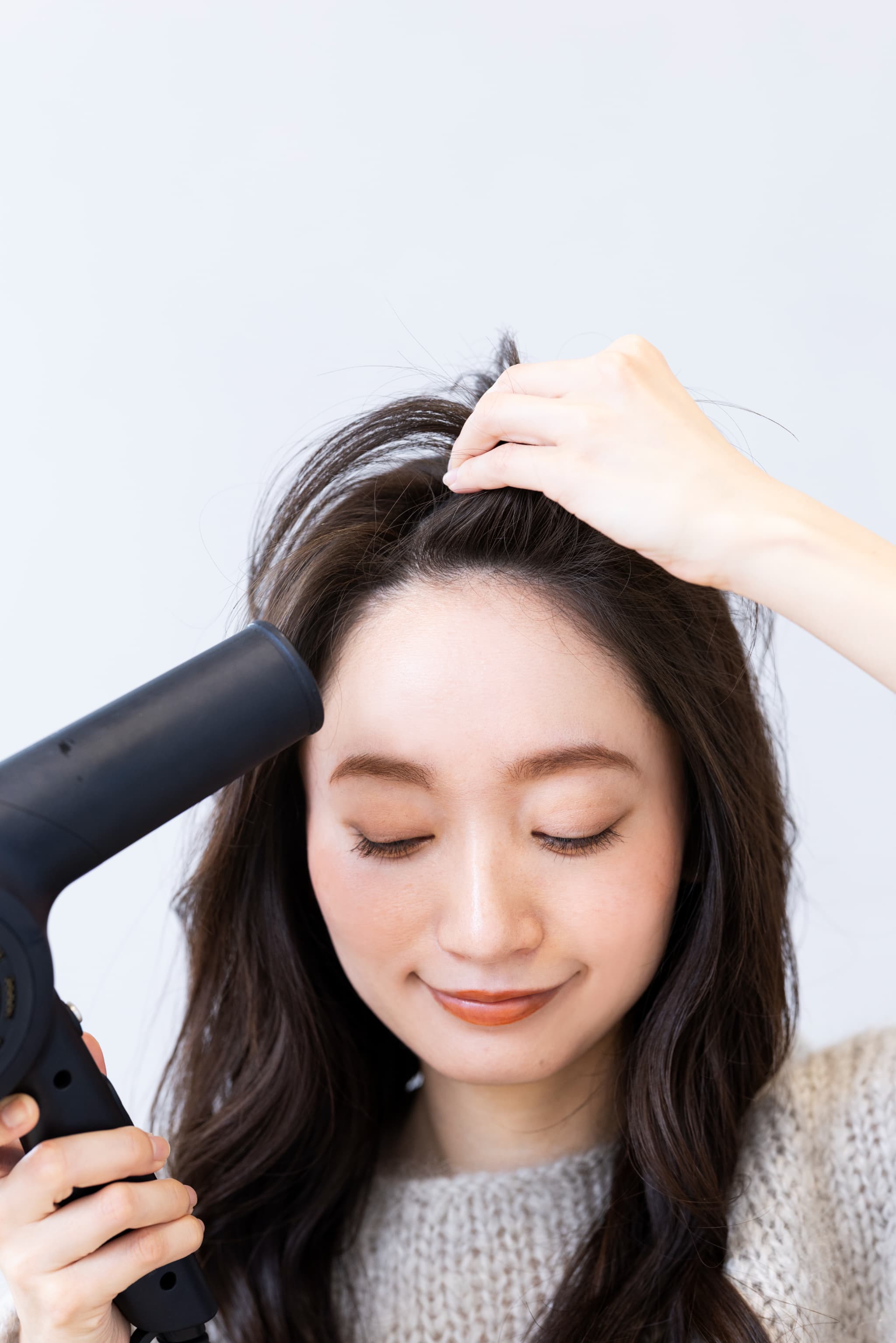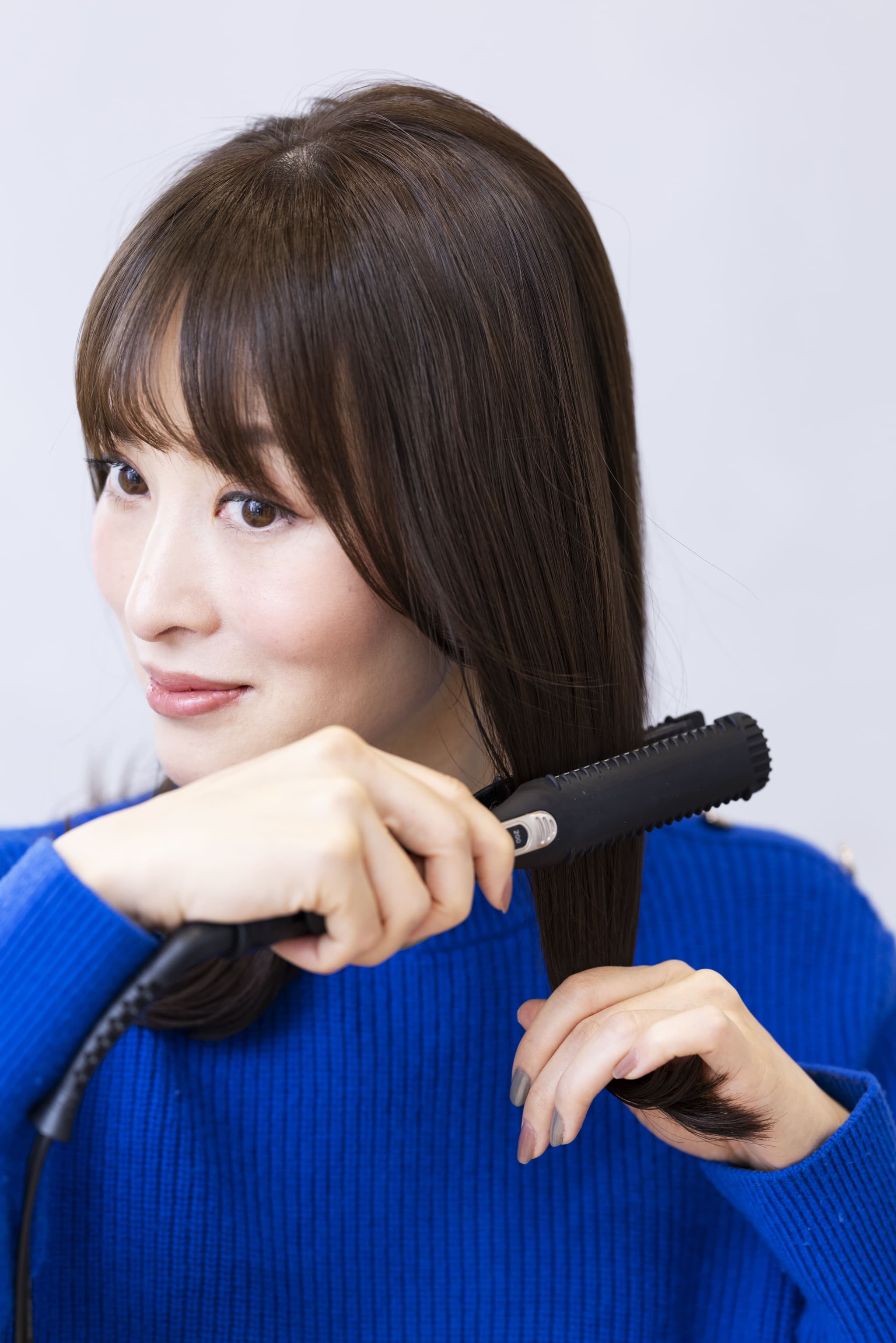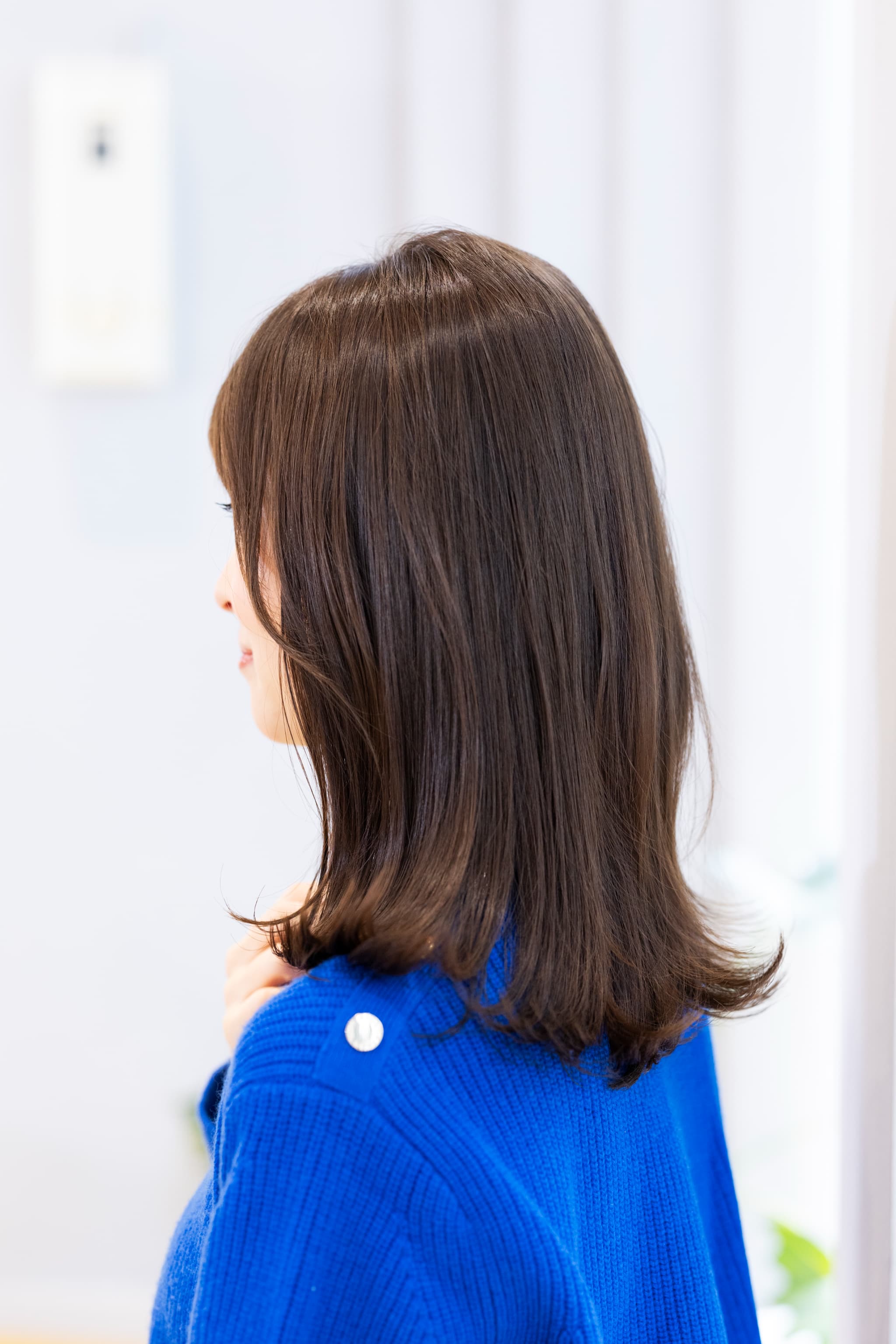 〈カット〉顔周りの髪をストレートにすることで顔をスッキリと見せるので、アゴくらいの長さがあれば大丈夫です。毛先を少しハネさせると今っぽく仕上がるので、毛先には軽くレイヤーを入れて厚みを取っておきます。前髪は短くても無くても影響はありません。