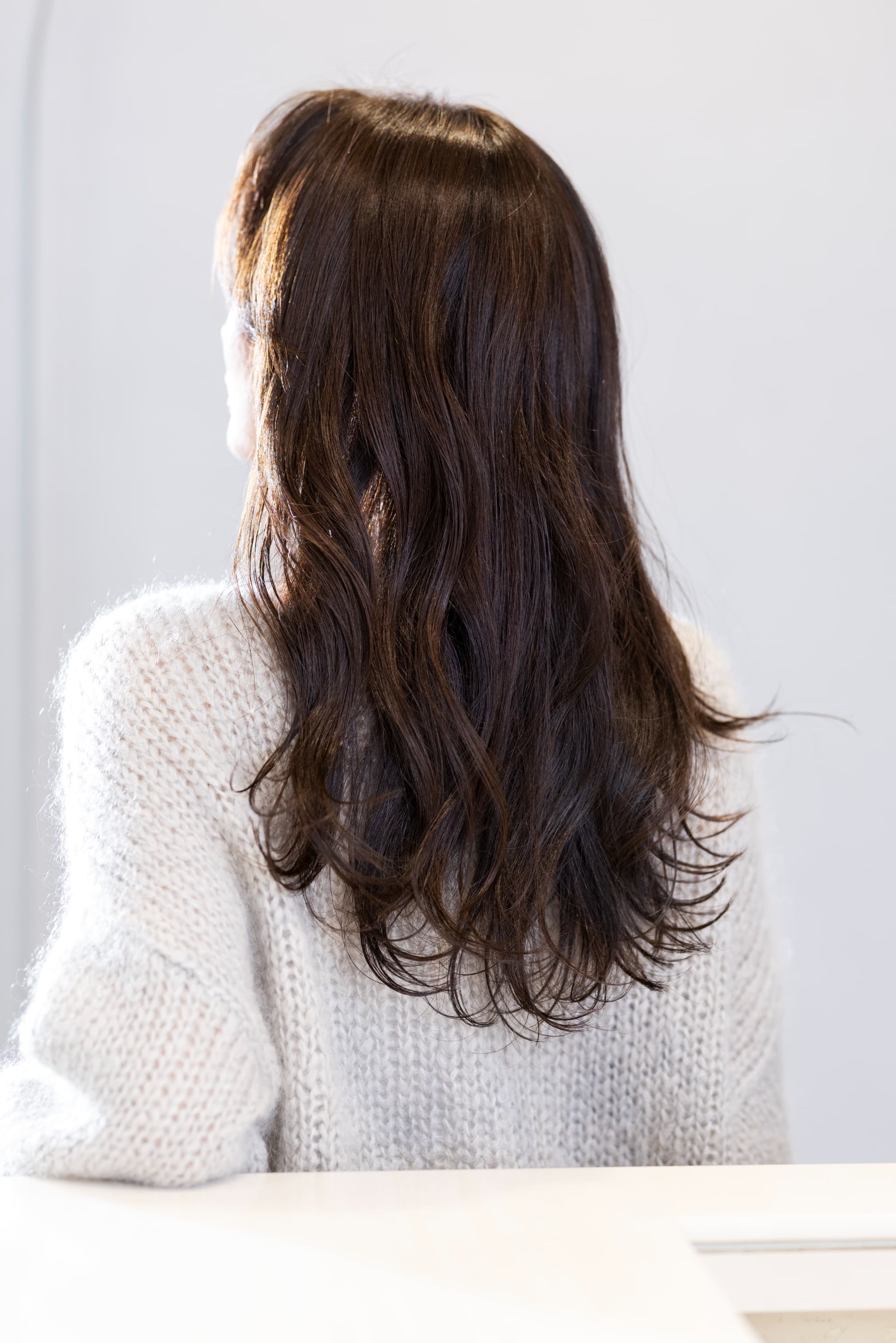 〈カット〉フェイスラインにかかる髪に、リップくらいの高めからレイヤーを入れます。前髪の有無や全体の長さは何でも大丈夫ですが、どちらもアウトラインがはっきり出ないように軽い質感にカットすると全体が軽い印象に仕上がります。