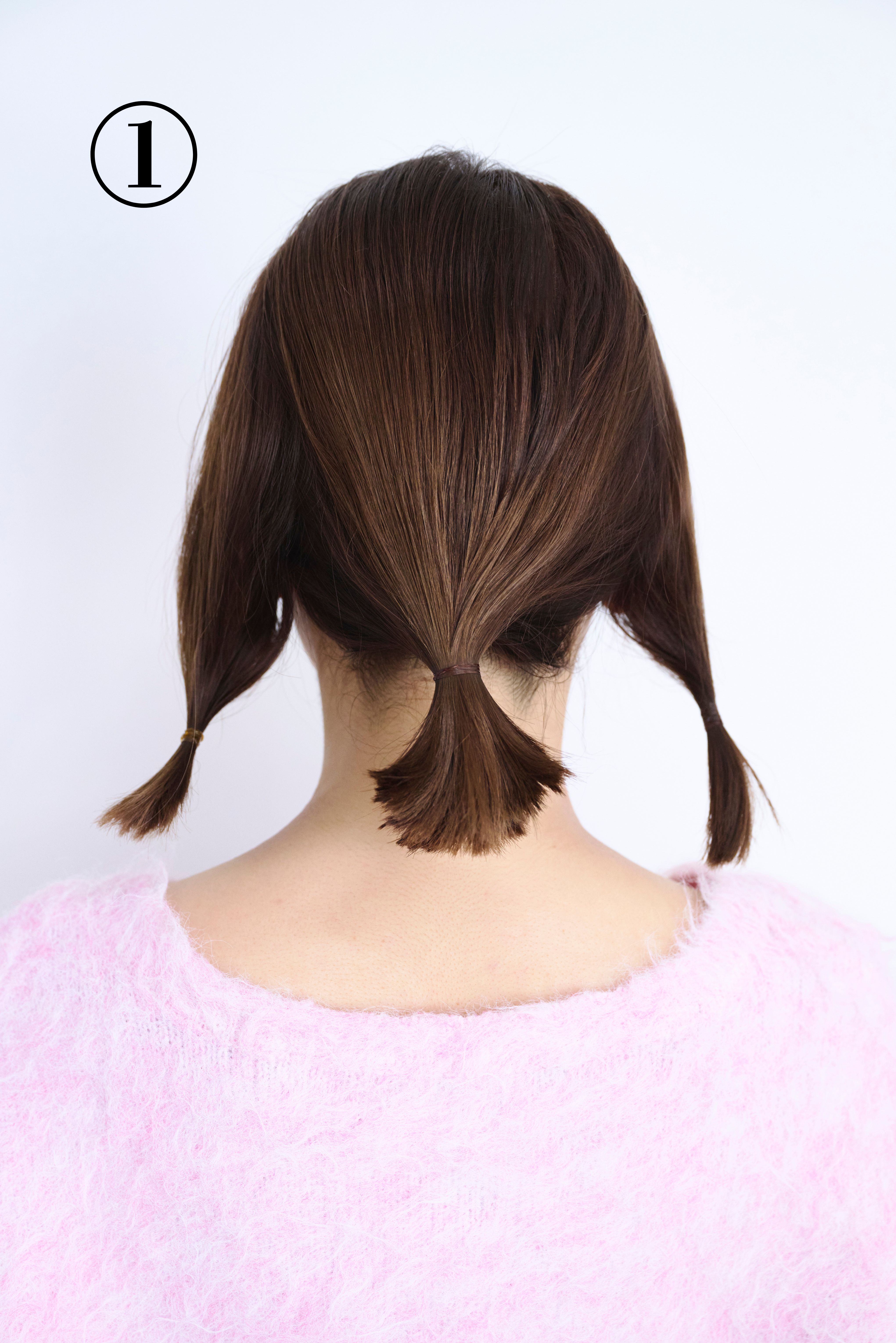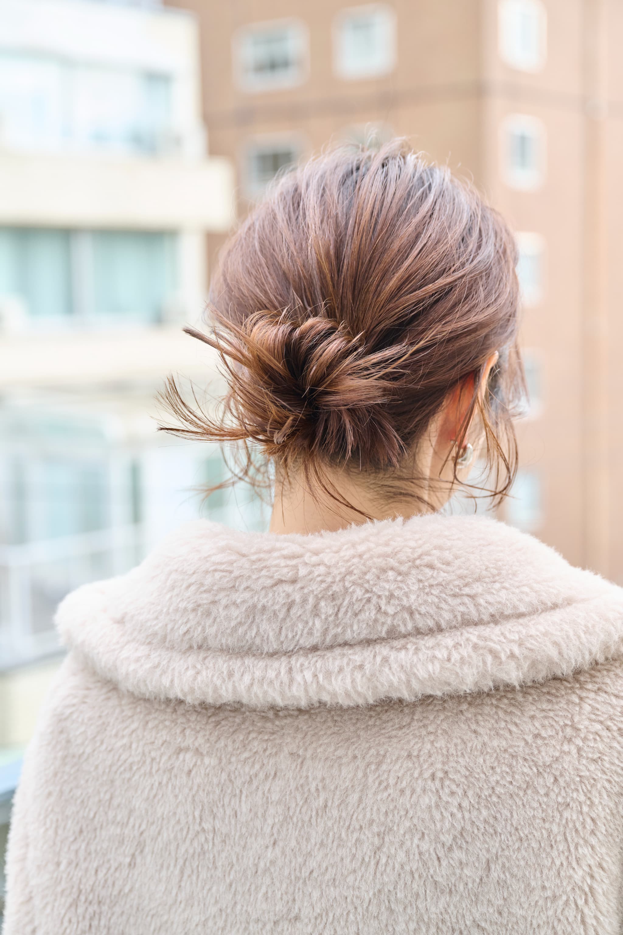 32㎜のカールアイロンで根元から毛先までラフにミックス巻きをします。全体を低めでゴムで結んだら毛束を丸め込み、もう1本のゴムを上からかぶせてシニヨンに。仕上げにシニヨンや顔周りの髪を軽く引き出します。