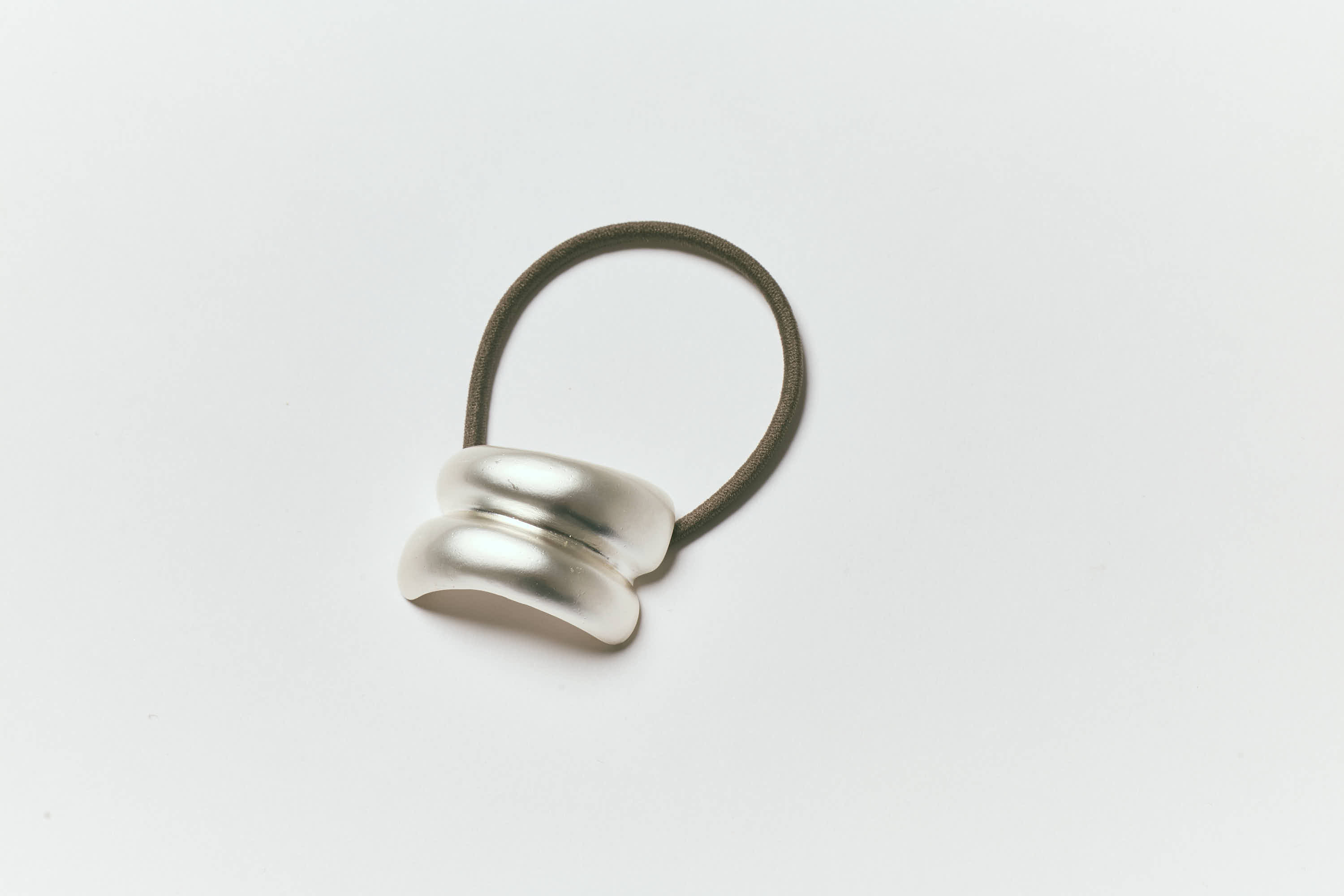 マットに加工されたシルバーのヘアカフス。これをつけるだけで涼し気に仕上がるので、これからの暑い時期に最適。シルバーヘアゴム¥1,210(MUK)