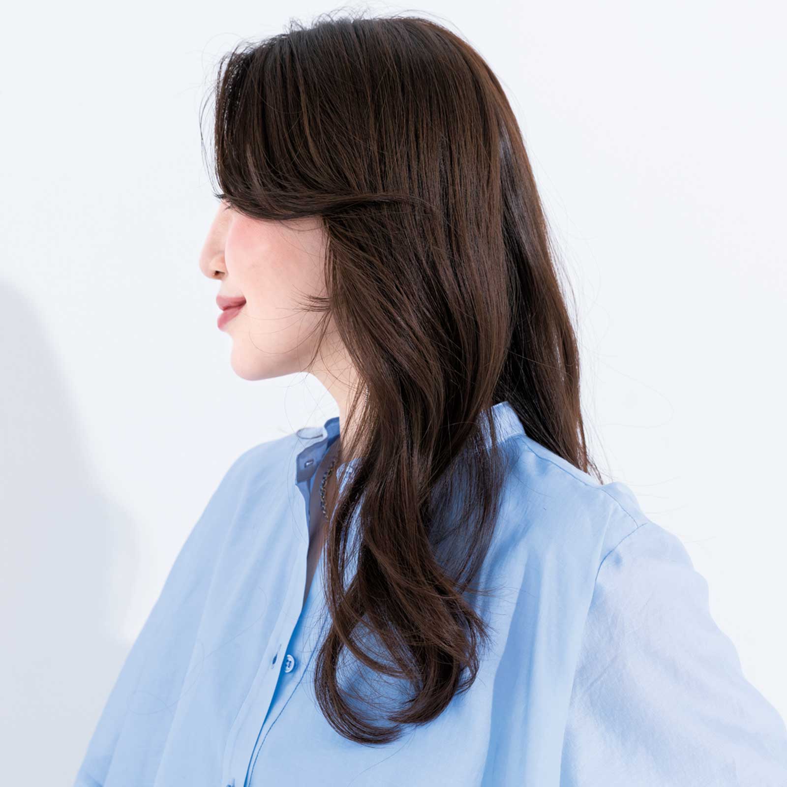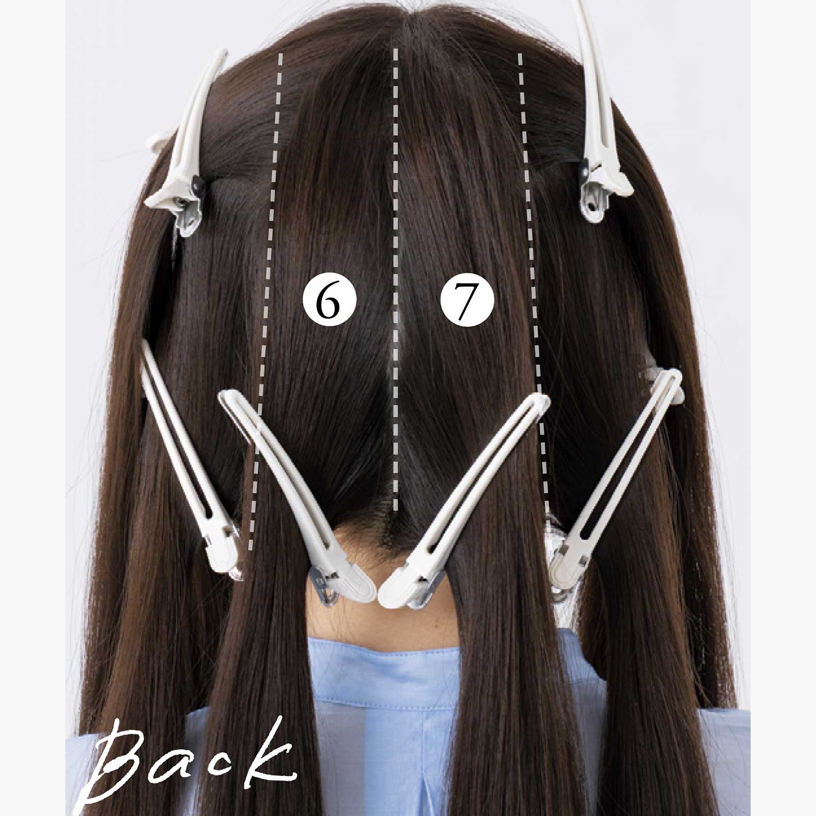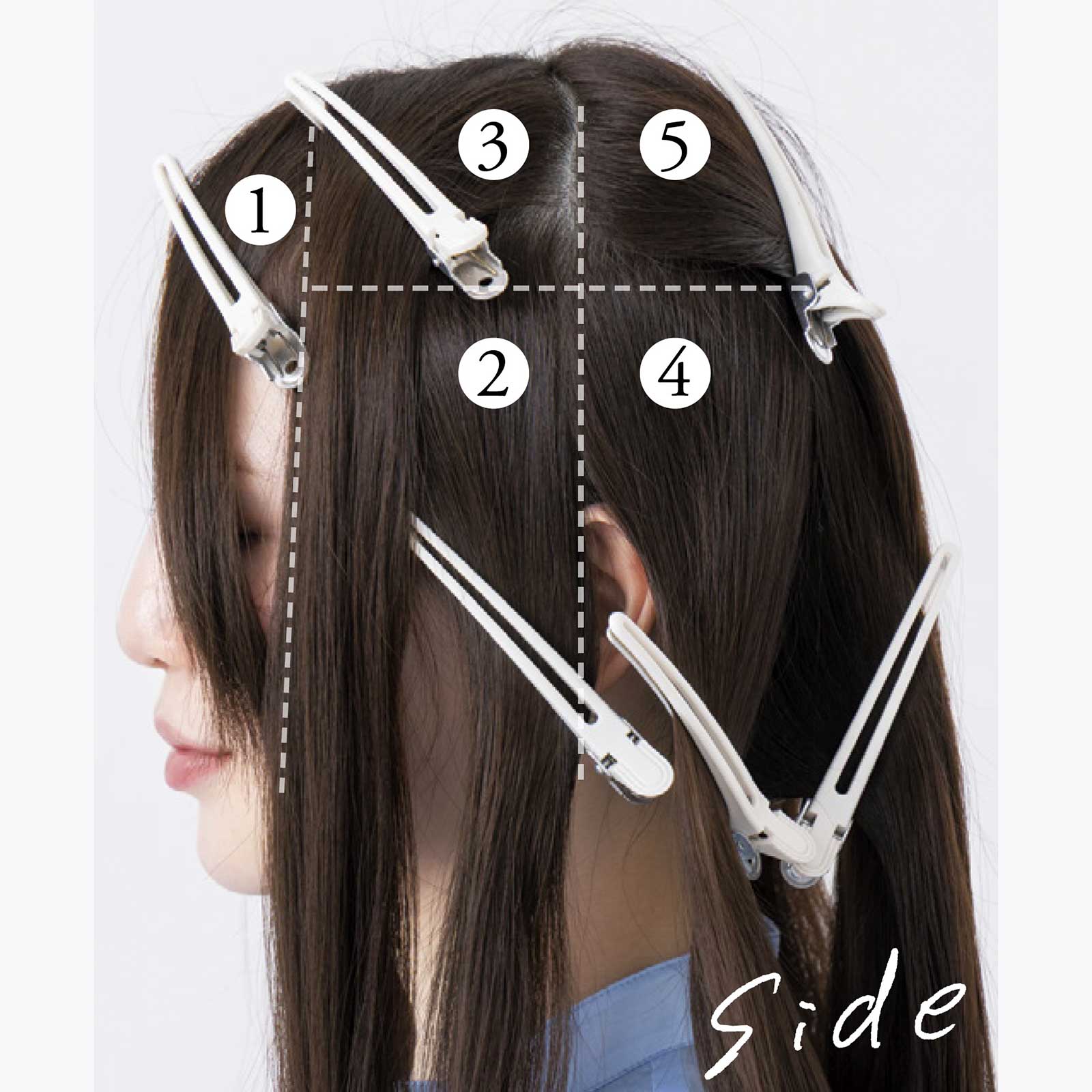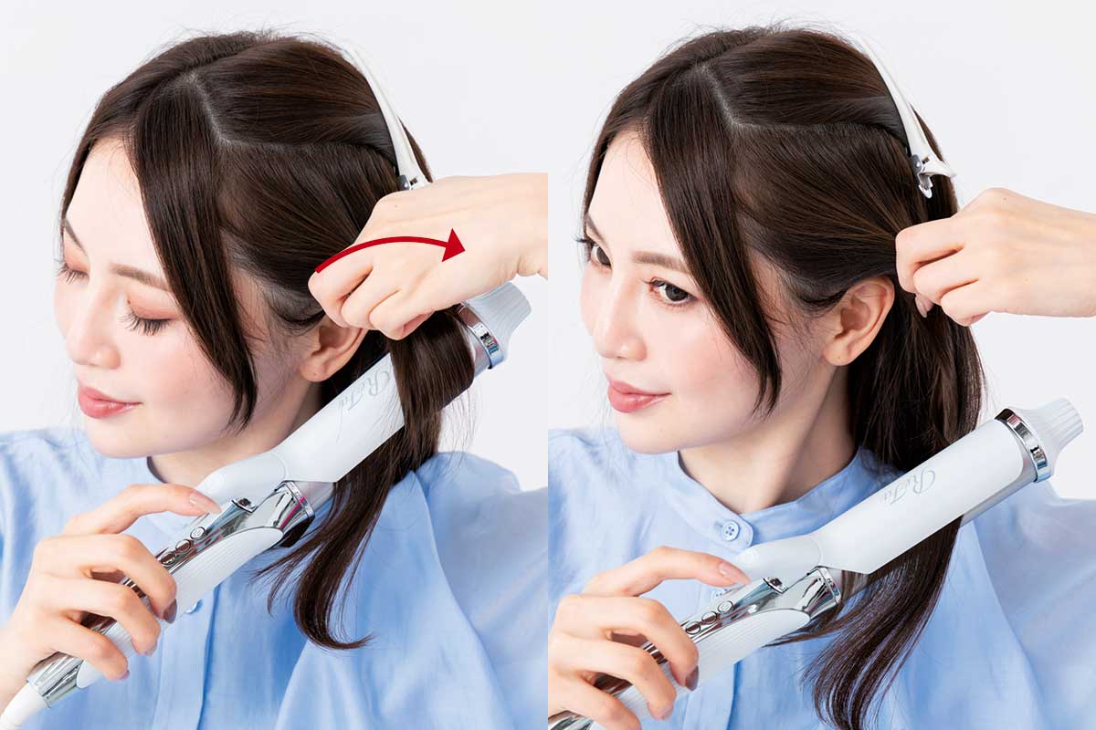 長い髪の全体をしっかり巻くには、中間から巻き始めて毛先までカールをつける“外し巻き”が必須。両サイドの髪は縦に分けるだけでなく上下2段に分けて、しっかり巻くとエレガントなボリュームが生まれます。