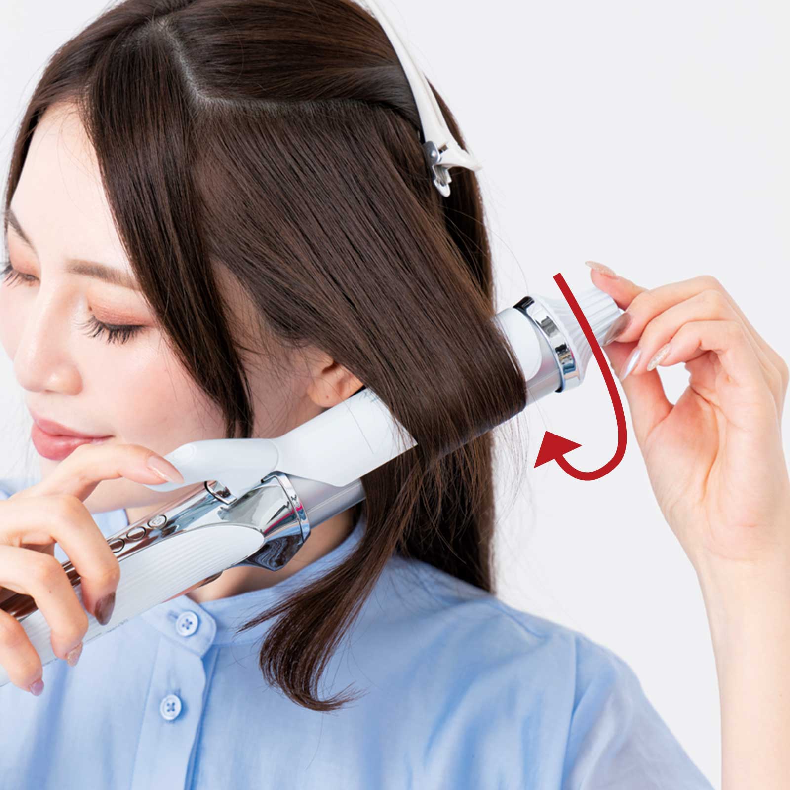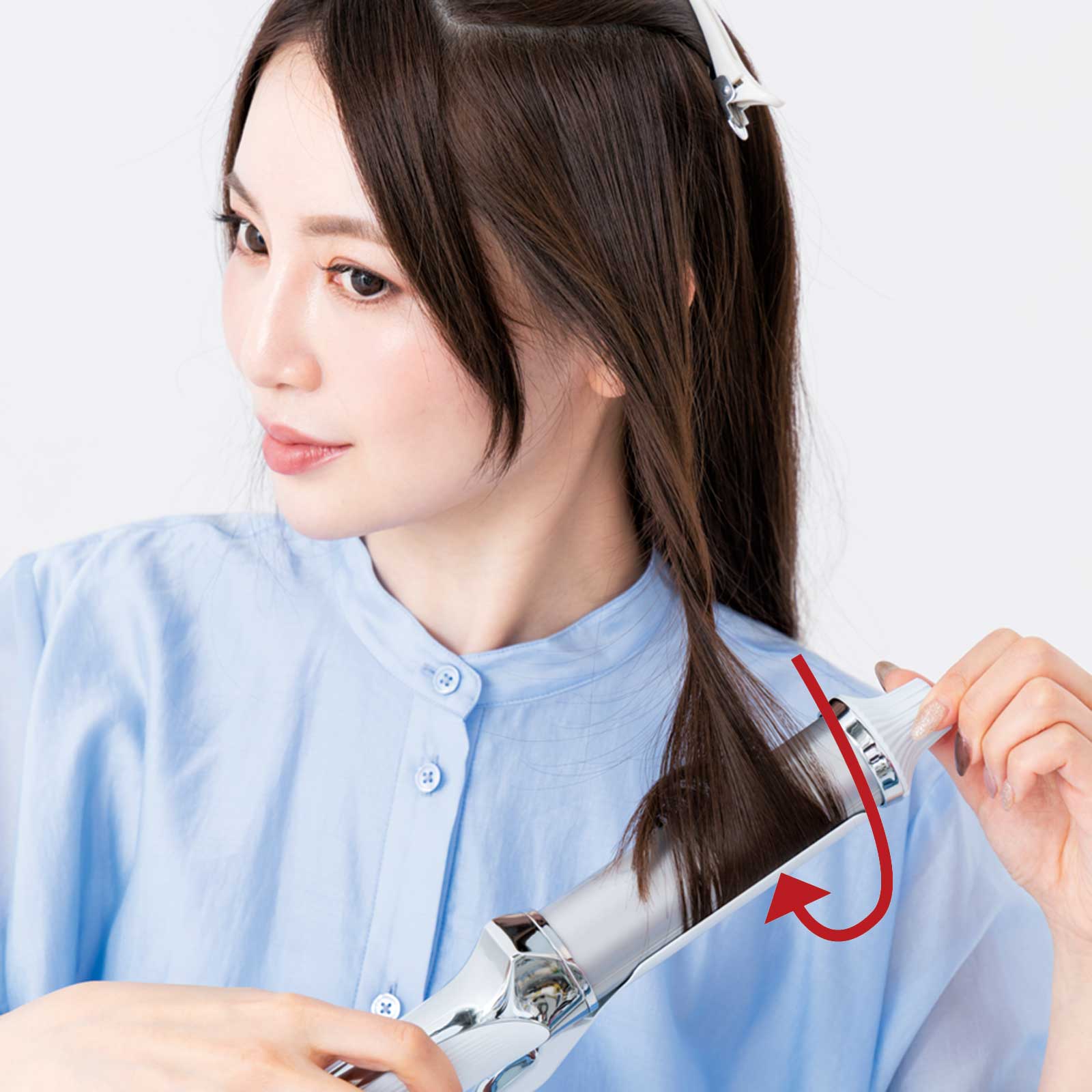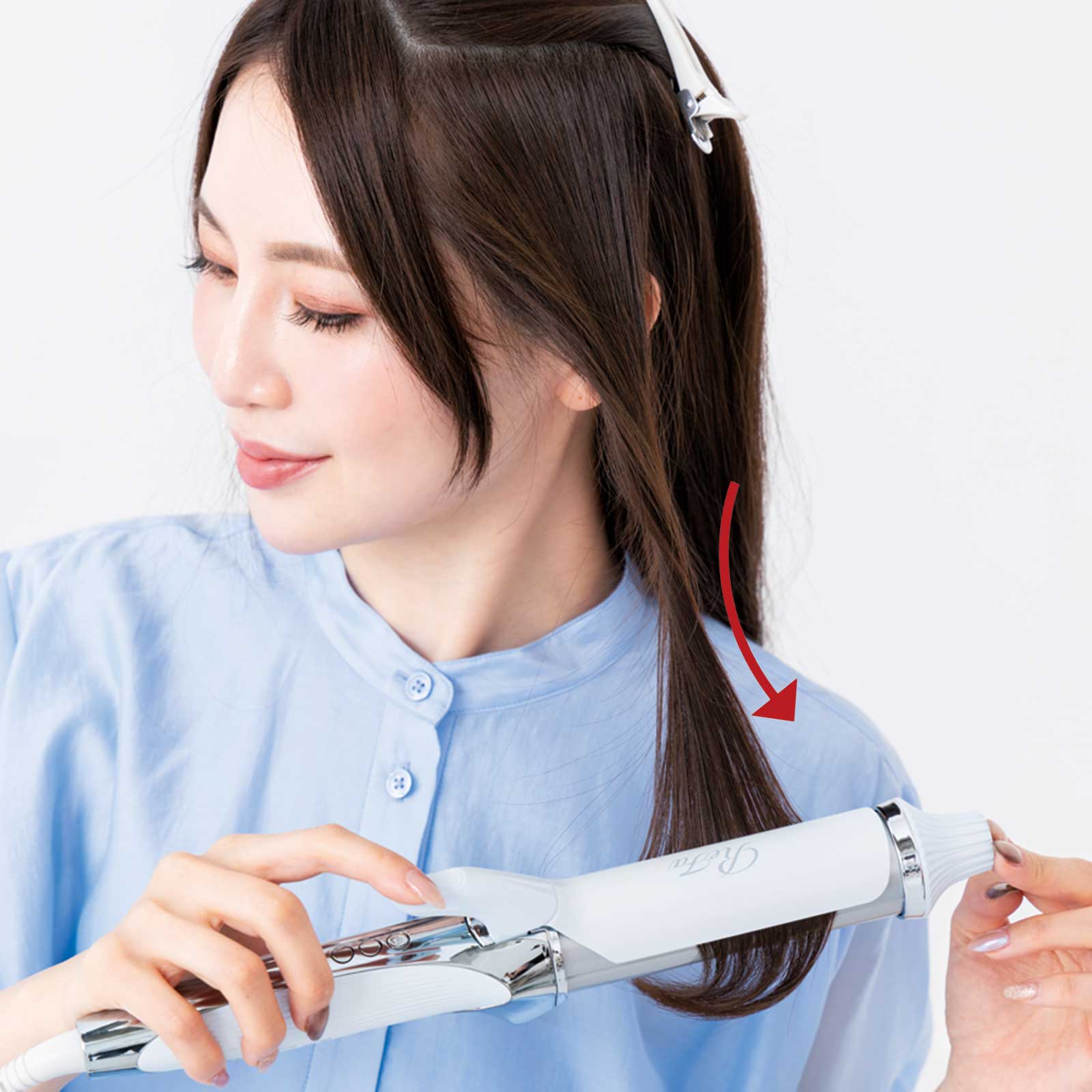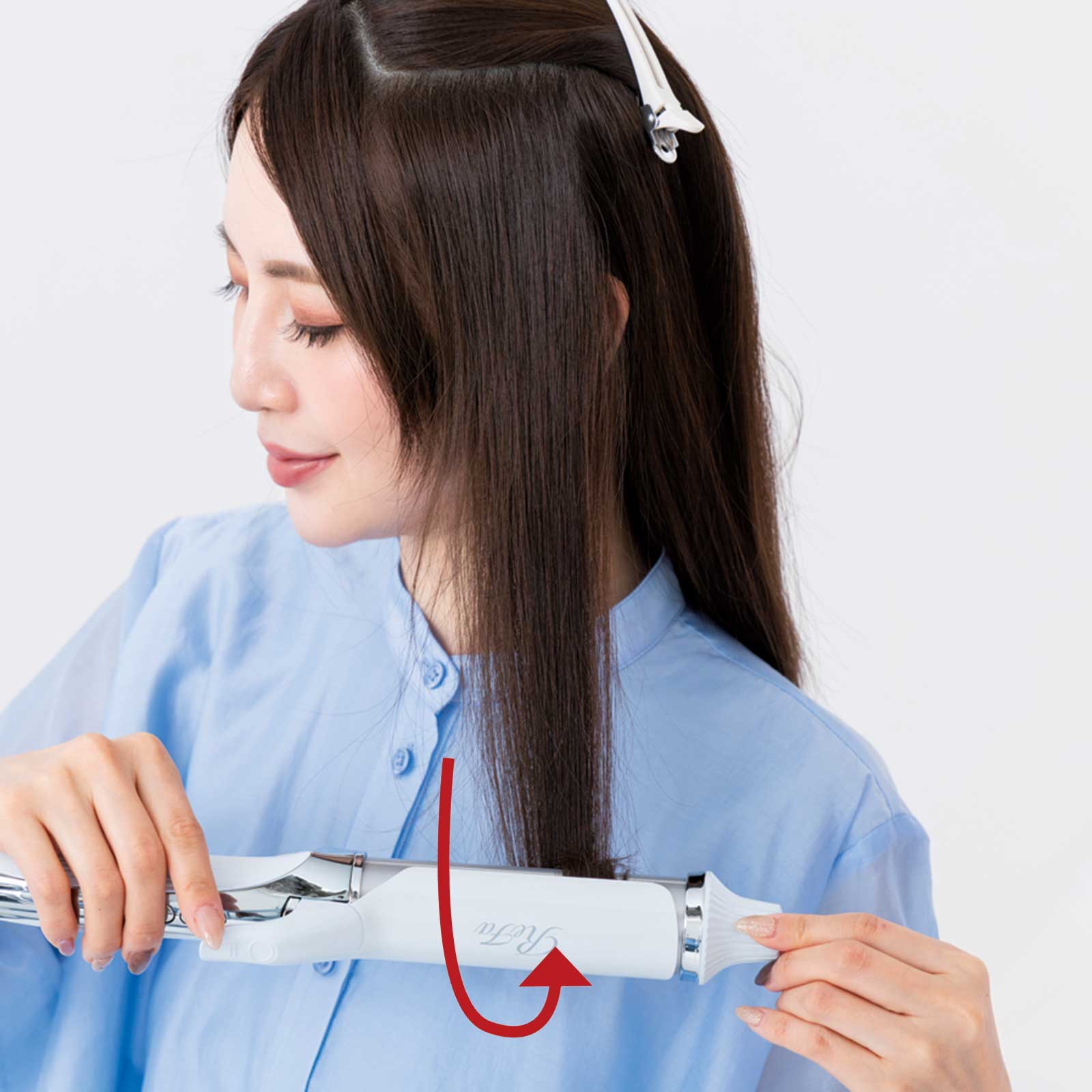 アイロンを内巻きに回転して、毛束の中間まで巻き上げます。