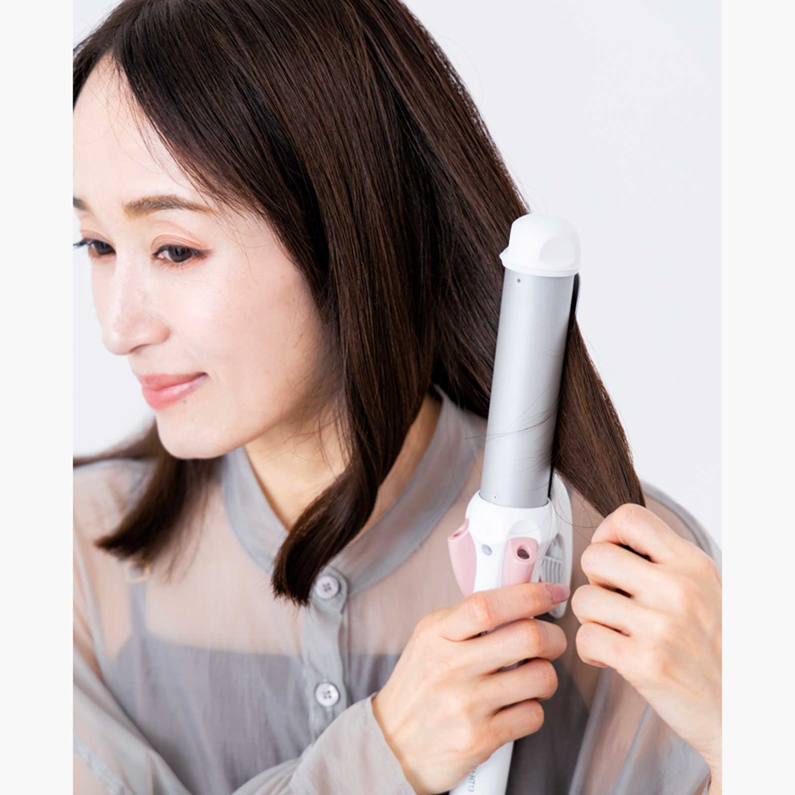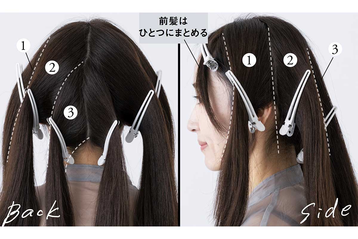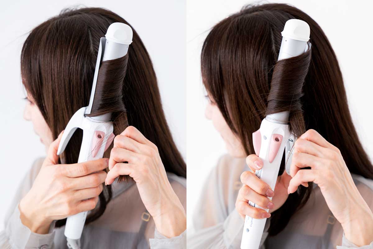 巻きを毛先に集中させないためには、アイロンを縦に使って毛束の中間から巻き始めることと、内巻きと外巻きを繰り返して毛先を散らせることが大切です。そのために、髪は縦スライスで分けるとうまくいきます。