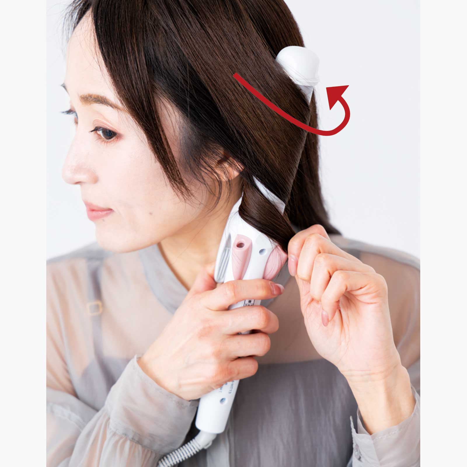 【1】で毛束をつまんでいた手を一度離します。外向きに回転させて巻き上げてから、もう一度毛先をつまみます。