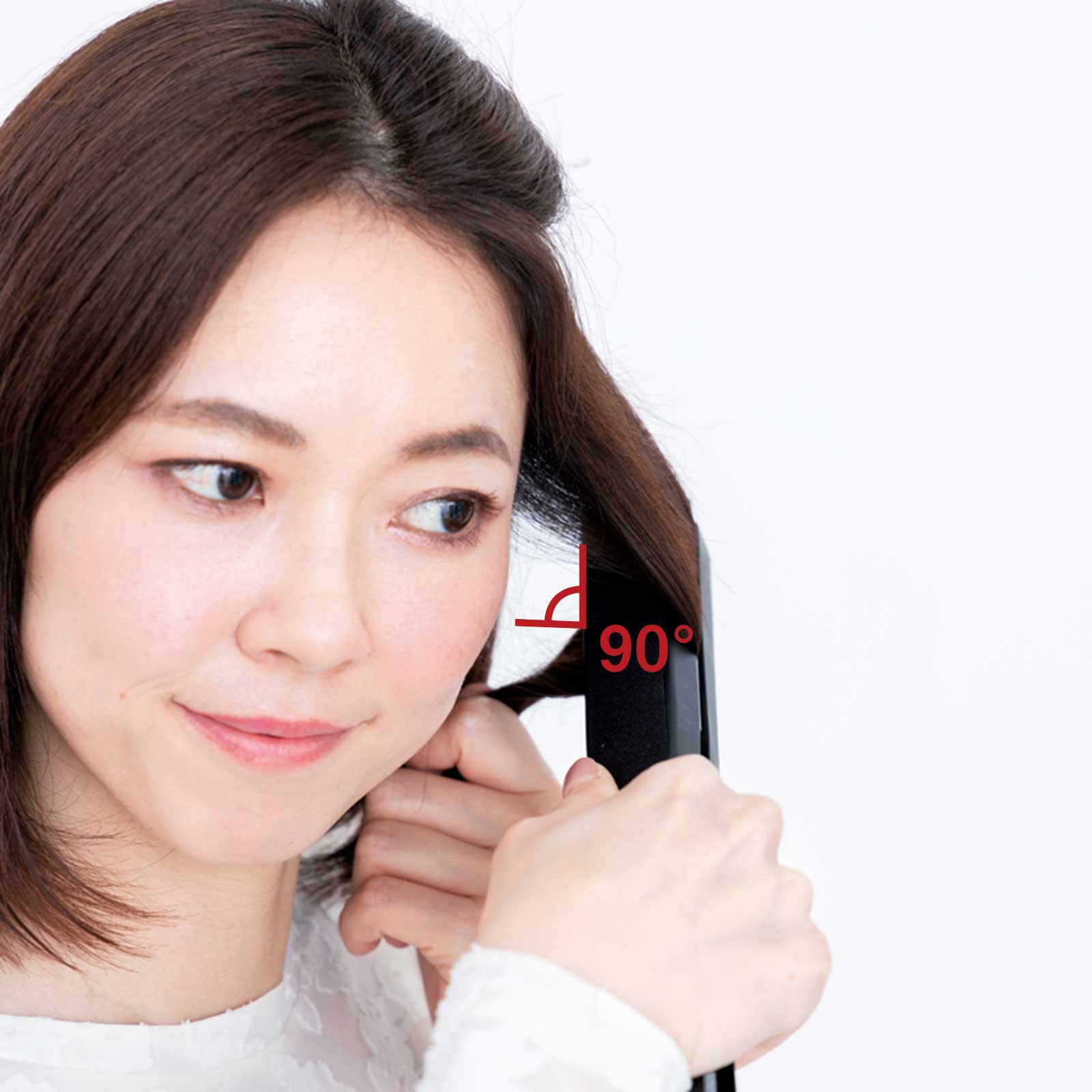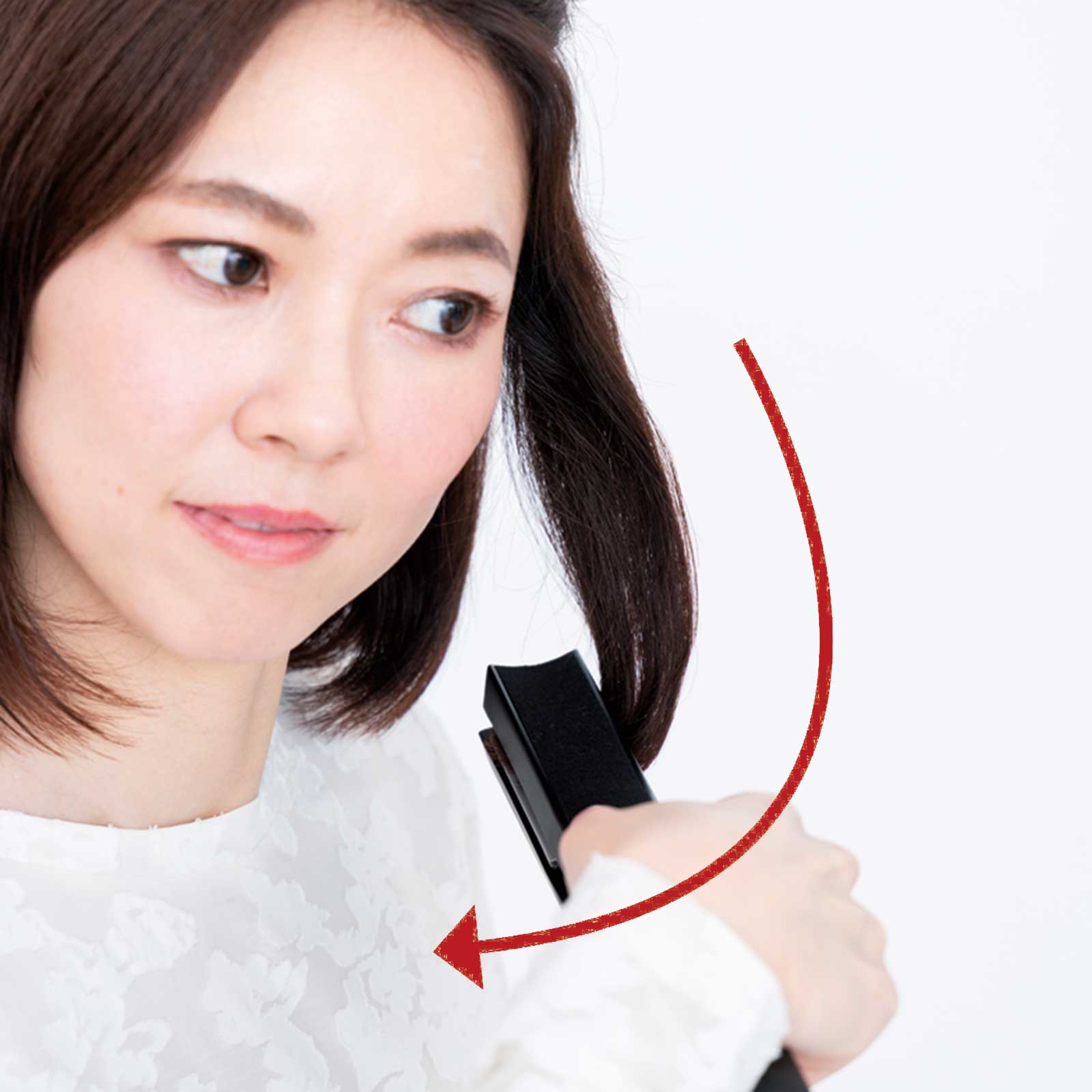 毛束を折り曲げたら、アイロンの角度も少し内側に回転させます。