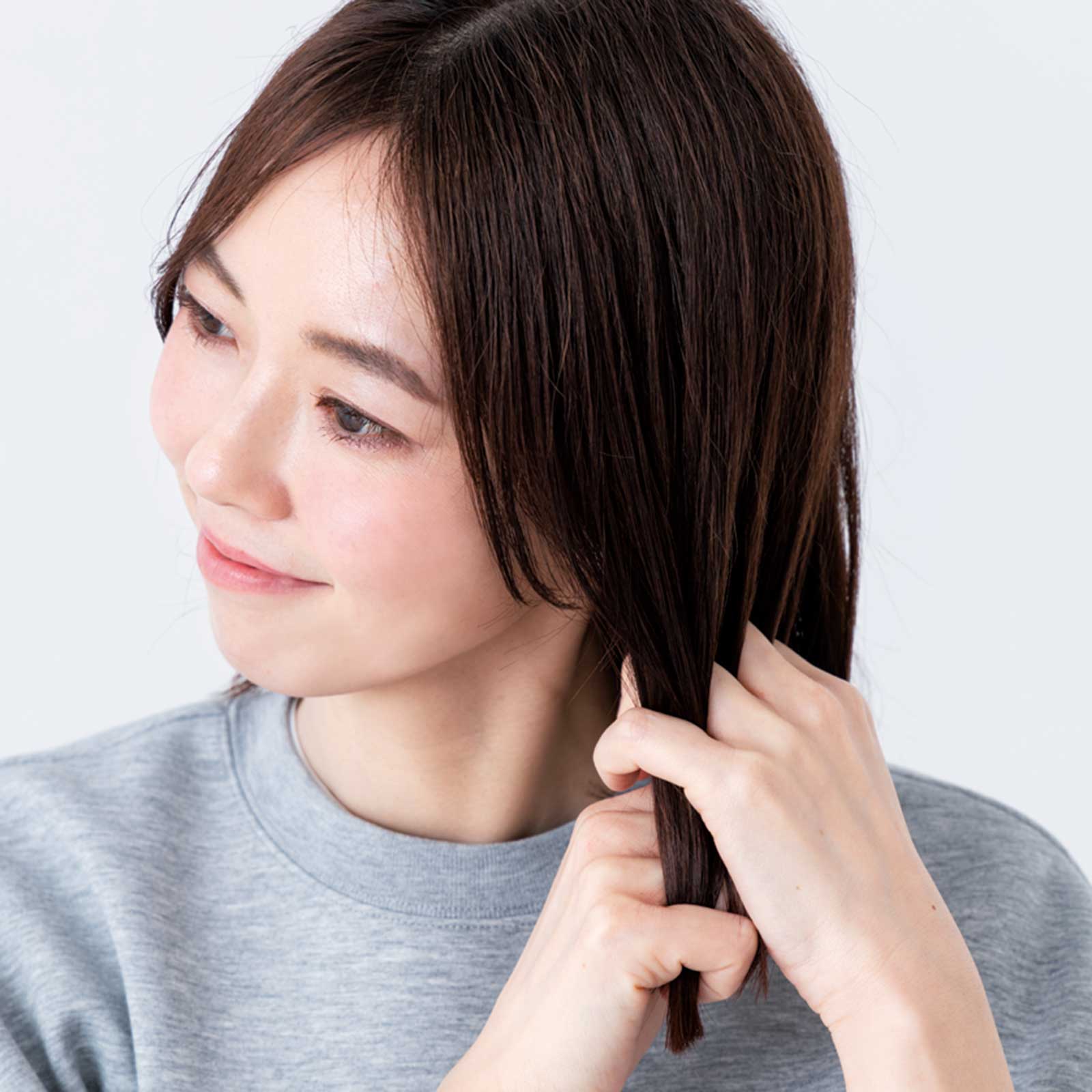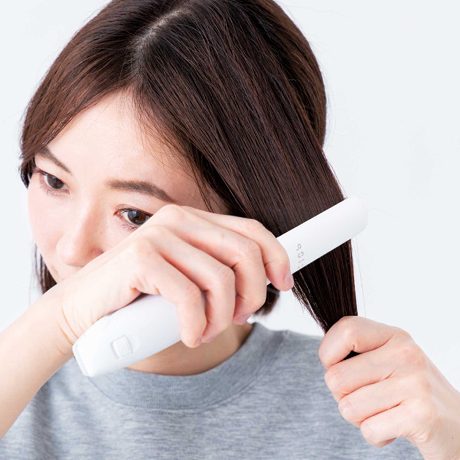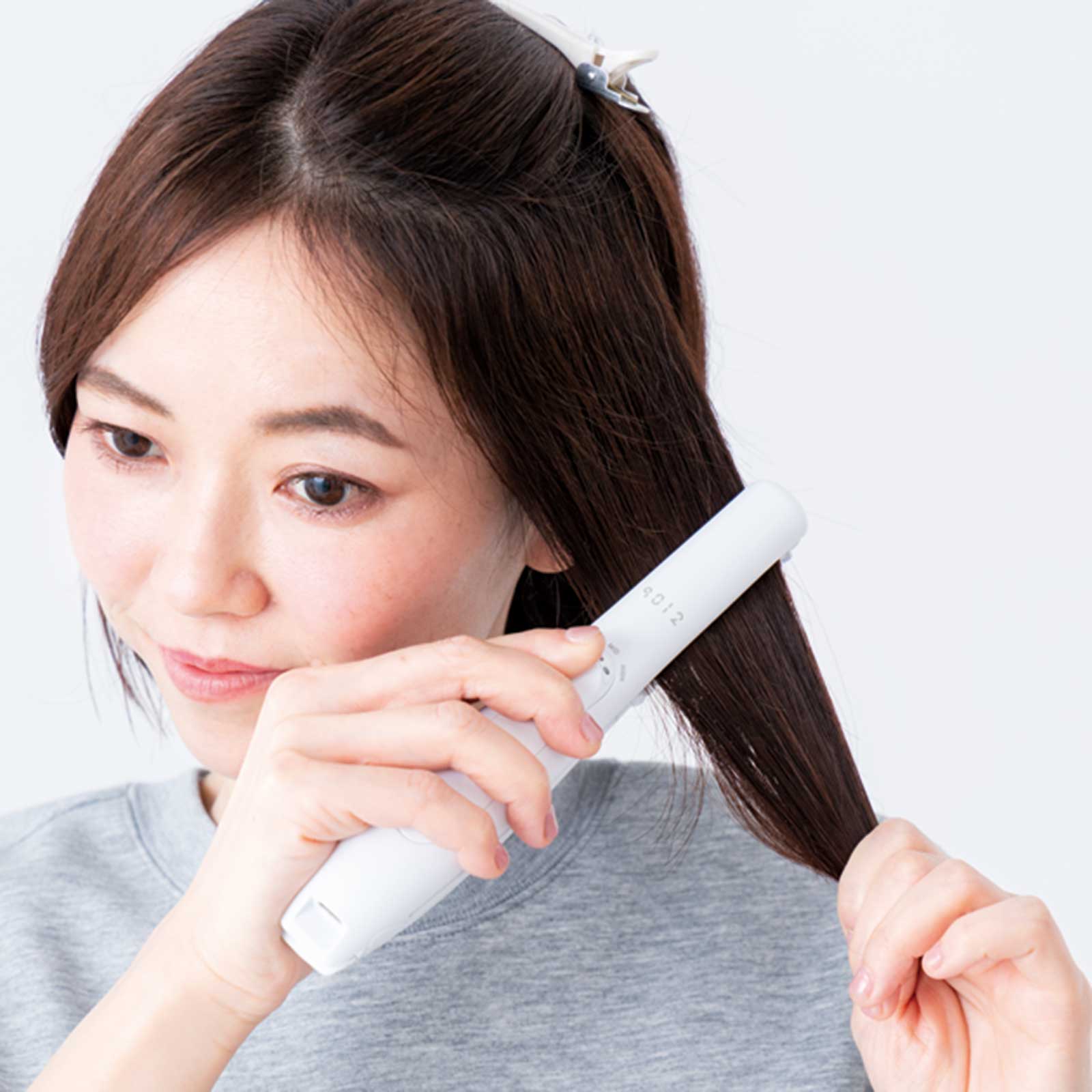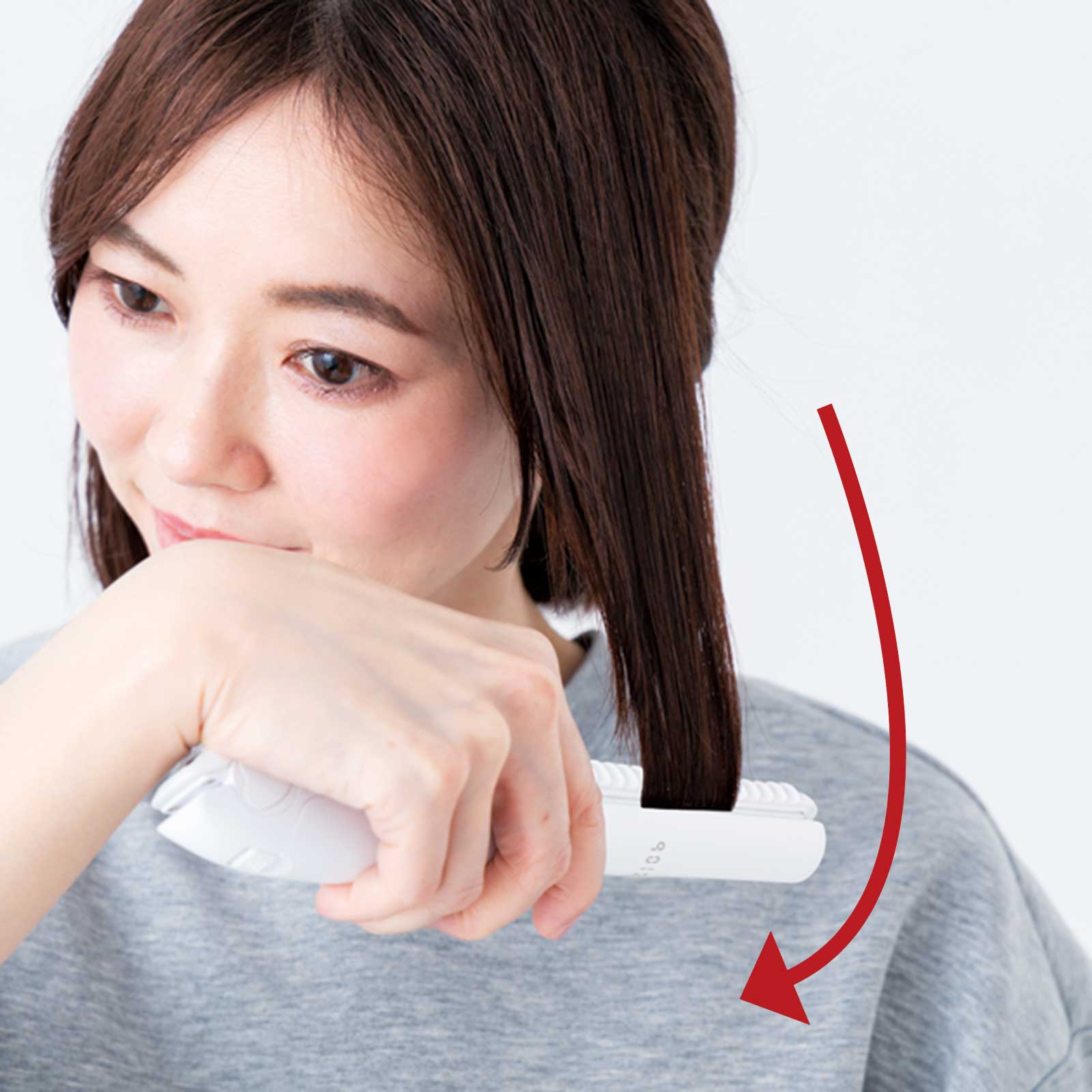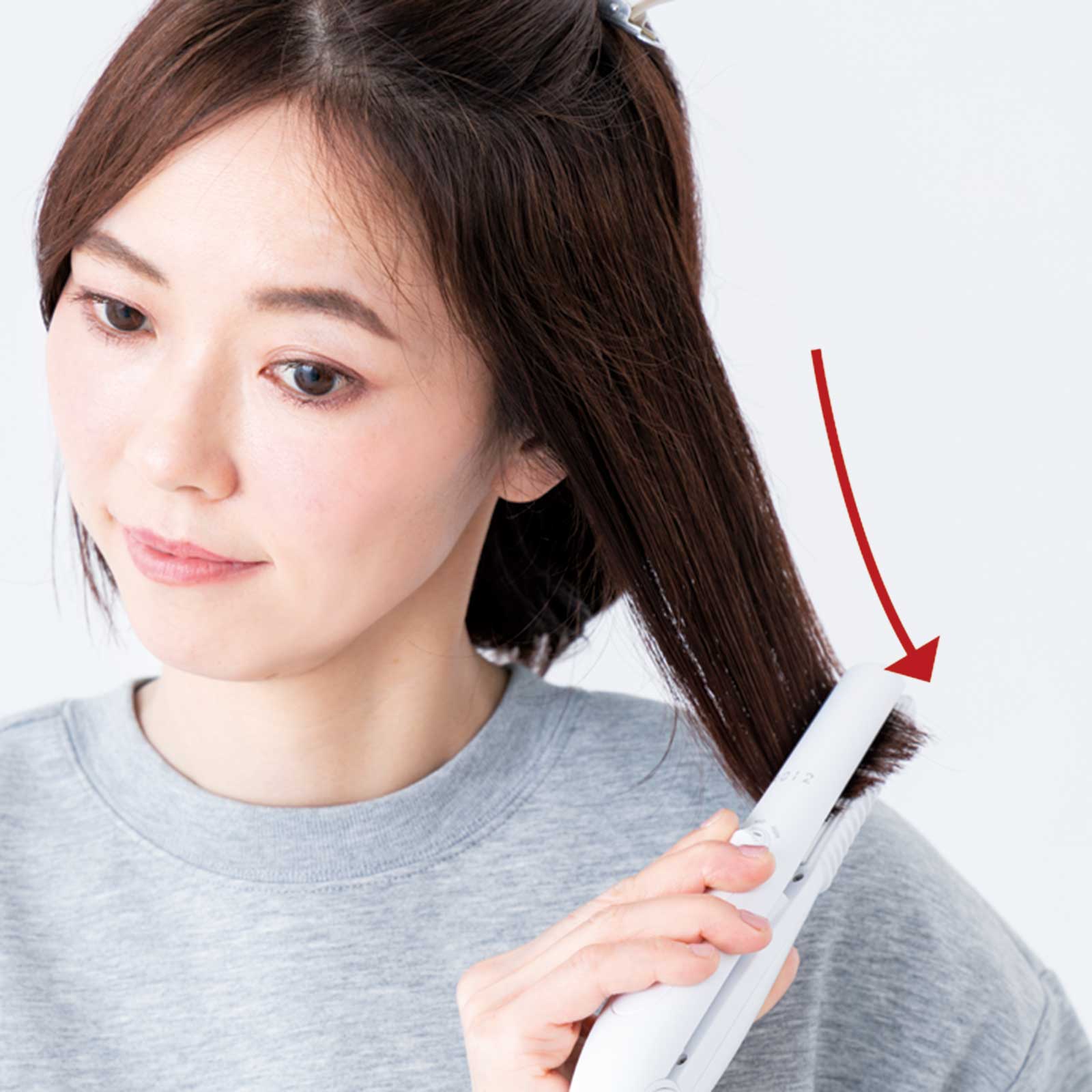 ゆるい“内巻き”の弧を描くように、アイロンで挟んだまま軽く引っ張りながら毛先までスライドさせます。