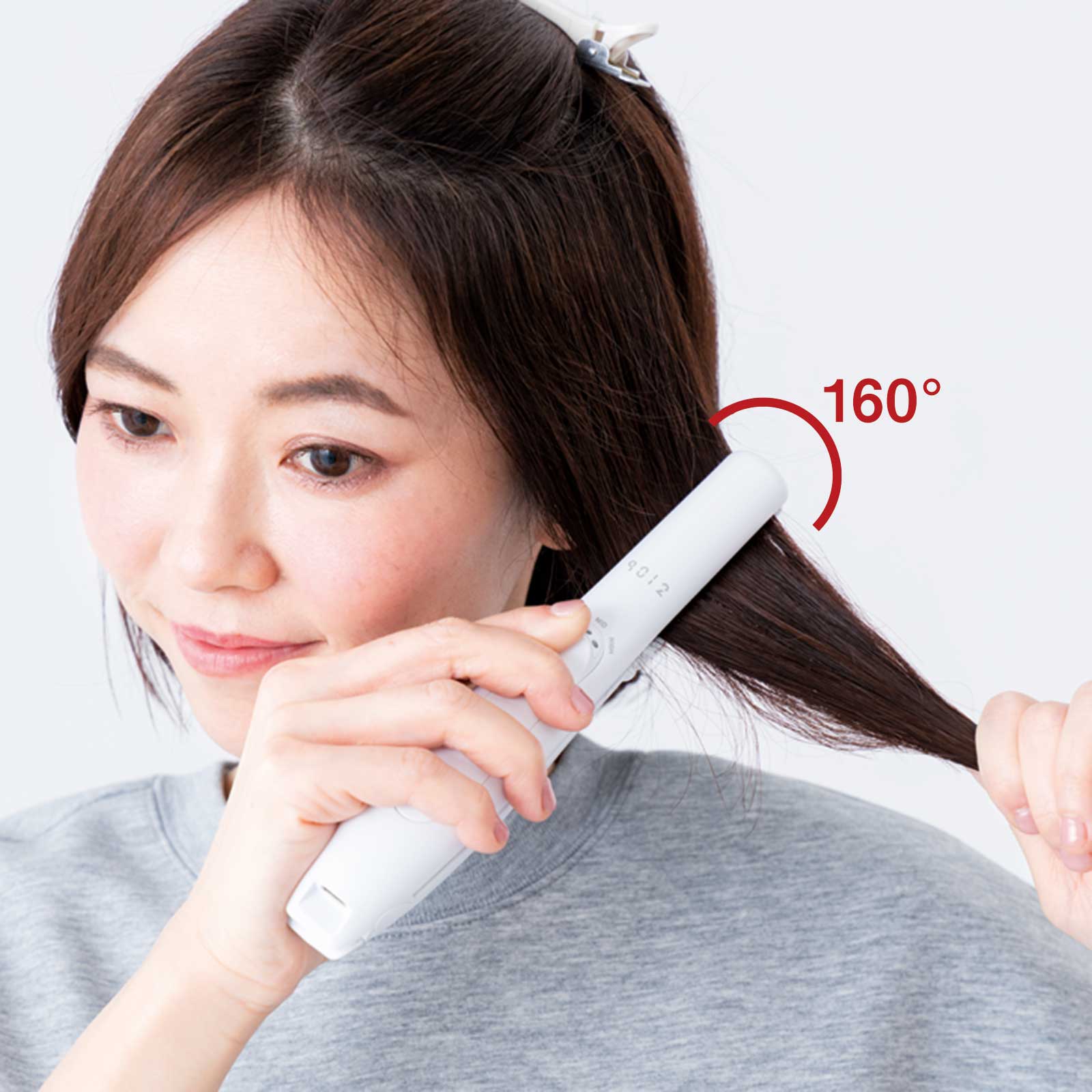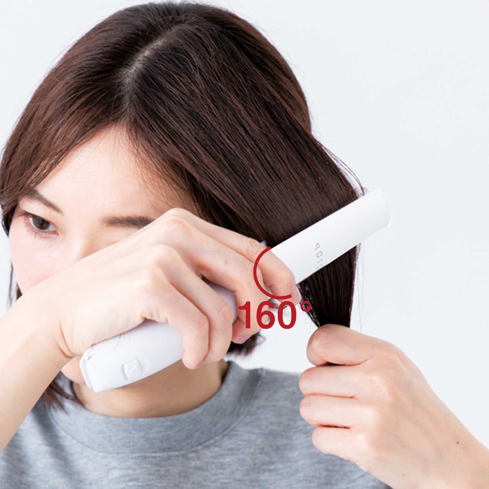 毛束を少し内側に折り曲げて角度をつけたら、アイロンも少し内側に回転させるときれいに巻けます。