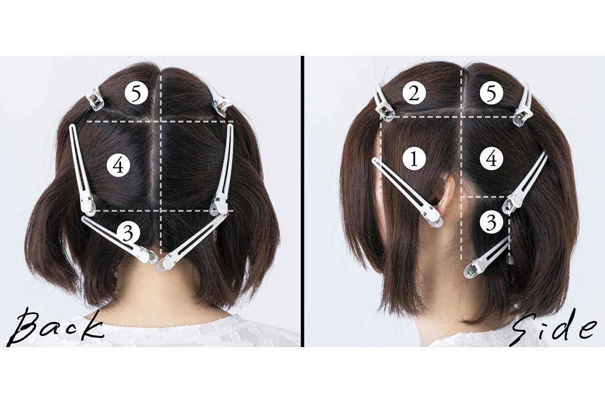 衿足の髪を“外巻き”することに加えて、表面の髪を“内巻き”することも重要です!表面の“内巻き”があることで軽く“外巻き”した衿足のハネが強調されるので、今っぽいカジュアルな雰囲気に仕上がります。サイドの前側は上下、後側は上中下に分けるとうまく巻けます。