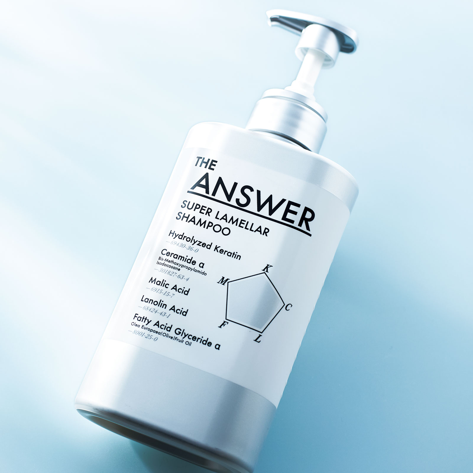 「1~2カ月に一度白髪染めやカラーリングを繰り返しているとケミカルダメージが蓄積し、キューティクルが開き、カラー分子がどんどん流出してしまいます。カラーリングを保持したい人は、洗浄力の高いものではなく、アミノ酸系のシャンプーに見直してみてください」美髪5大必須成分などヘアケア成分をたっぷり配合したアミノ酸系シャンプー。THE ANSWER スーパーラメラシャンプー 400ml ¥1,760(花王)