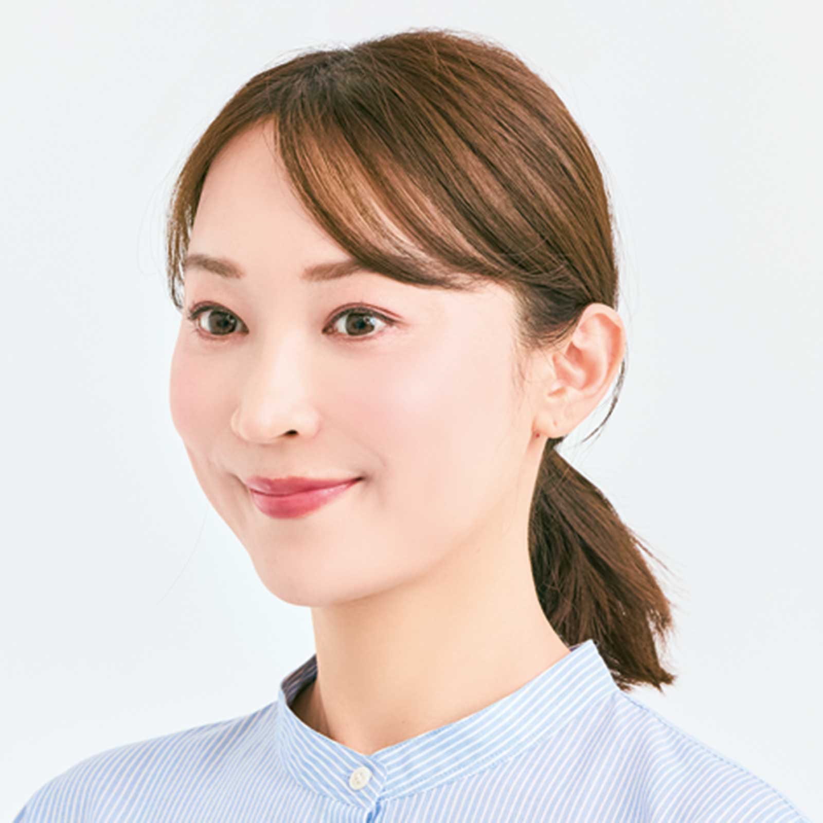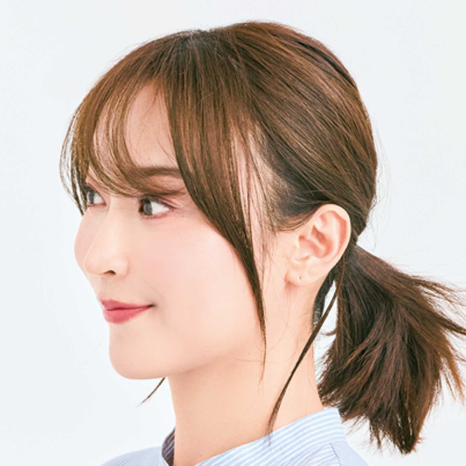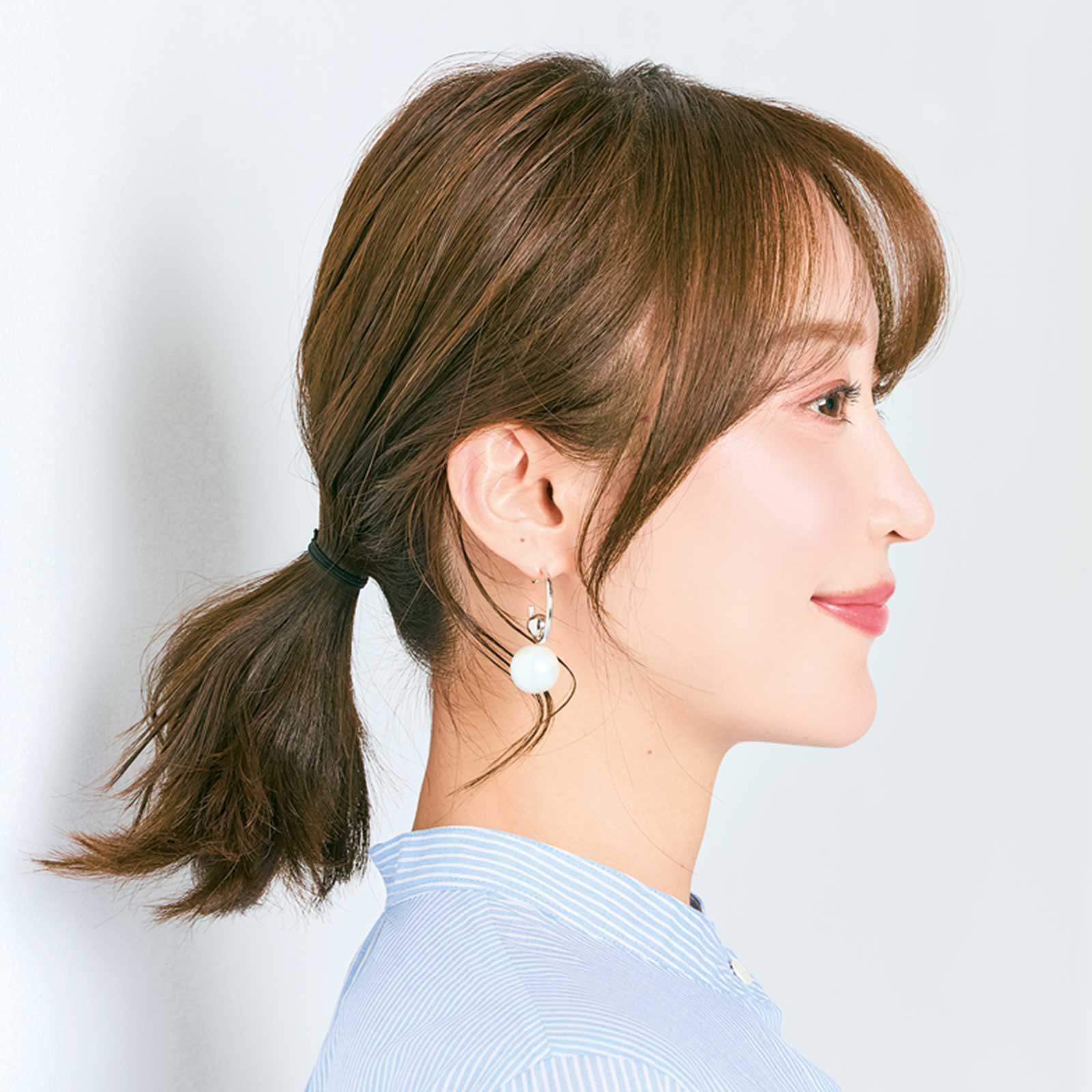 前髪やサイドバングを顔周りにたっぷり下ろしたことで、疲れて見えがちなひとつ結びが一気にこなれた印象になりました!