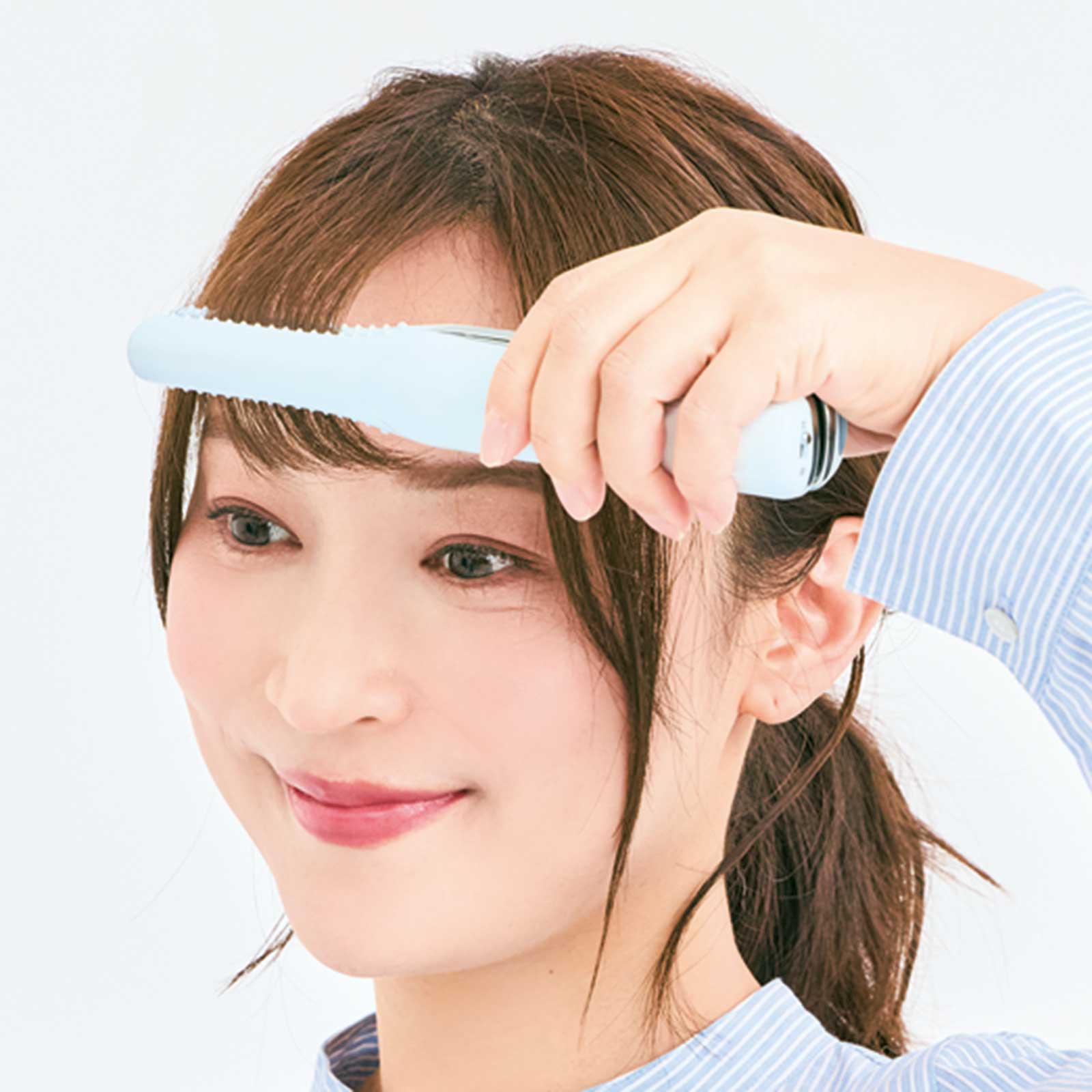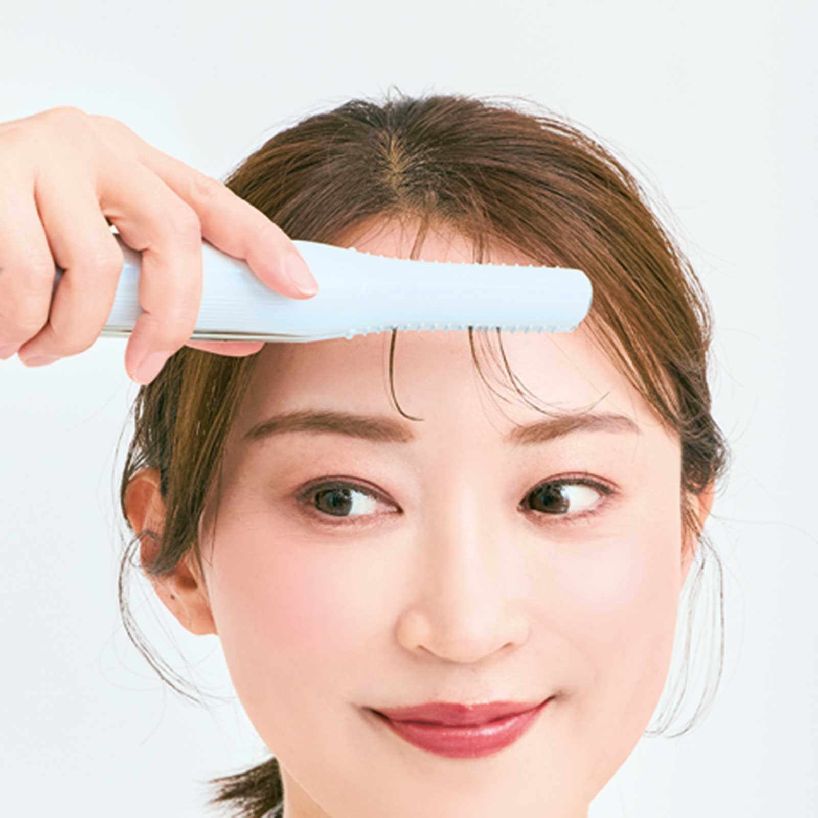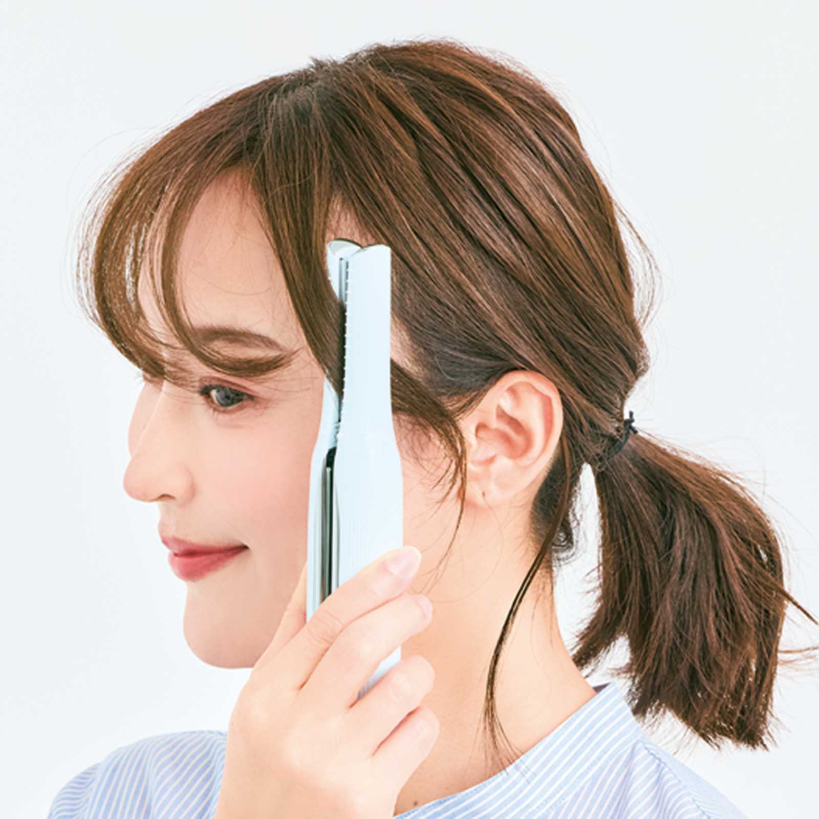 3.前髪の根元をアイロンで挟み、毛先までスライド。毛先だけ軽くカールがつく程度にします。もみあげも同様に。