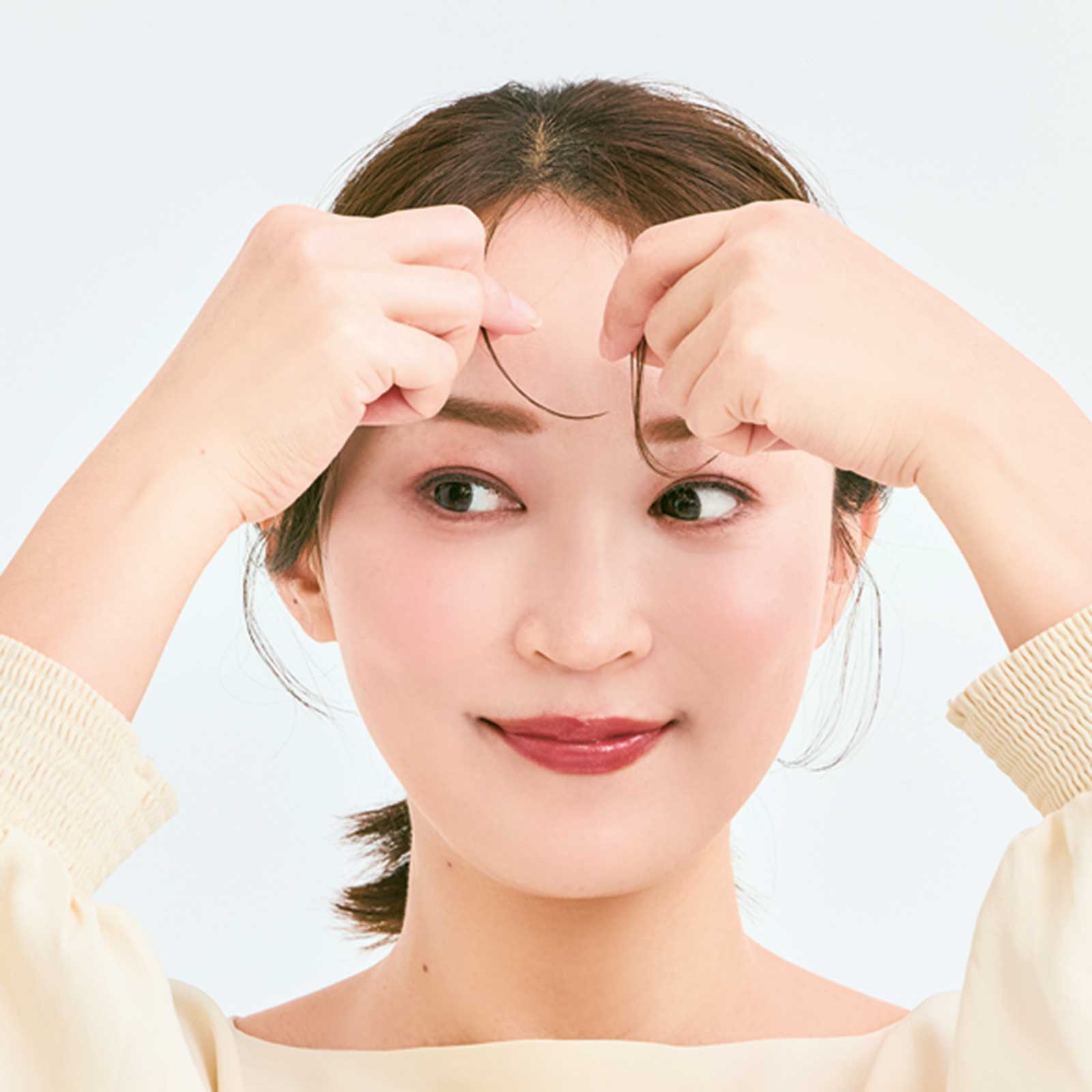 厚めの前髪と頰にかかる髪を下ろすと、顔周りで揺れる毛先がアクセントになって華やかさがアップします! 小顔効果もあるので、マスターしておくと便利です。
