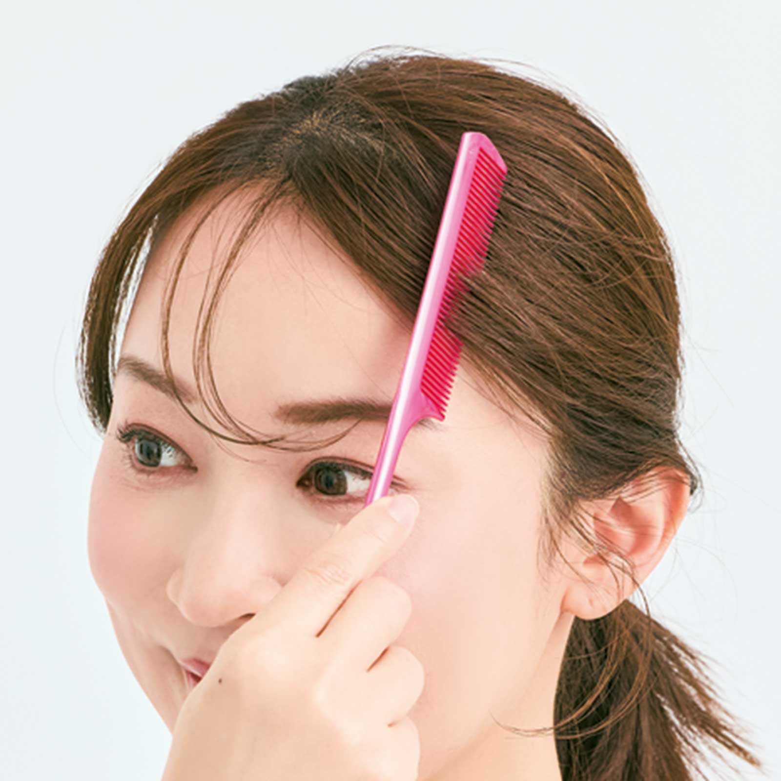 2.おでこの生え際が出ると老けて見えるので、コームでなでつけて隠します。バランスを見ながら数回コームを通して。