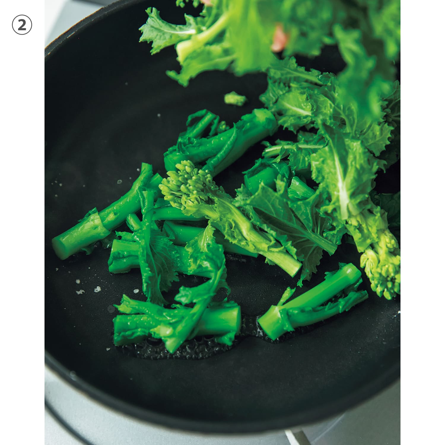①菜の花は茎の先をカットして水あげしてから使うとより柔らかく。②加熱はビタミンを逃さないように蒸し煮で。