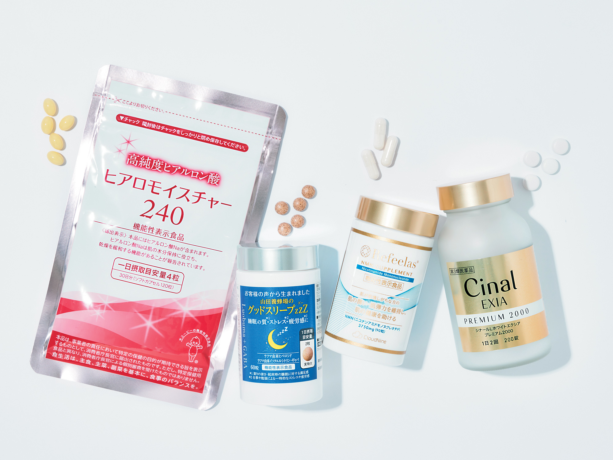 (左から)純度90%以上の高純度ヒアルロン酸で乾燥に負けない肌に。ヒアロモイスチャー 240 120粒 ¥5,400 (キユーピーウエルネス)睡眠の質を改善。良質な睡眠は美肌を作る近道に。山田養蜂場のグッドスリープZZZ 60粒¥4,752 (山田養蜂場)NMNサプリメントで日本初の機能性表示食品。Refeelas 90粒 ¥16,200(CloudNine))シミ対策成分※(※ビタミンC、L-システイン)をシナール史上最大量配合。シナール L ホワイトエクシア プレミアム 2000【第3 類医薬品】200錠 ¥5,940 (シオノギヘルスケア)