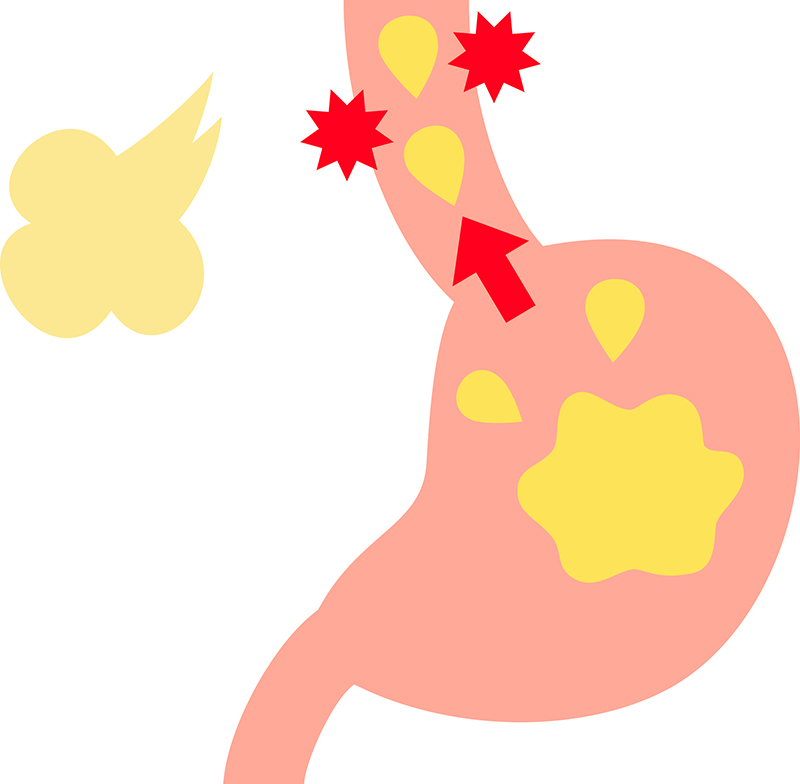 ゲップの背景には、消化器系の病気が潜んでいる場合もあります。代表的なのは「逆流性食道炎」です。逆流性食道炎は胃の内容物が食道に逆流して食道に炎症を起こす病気で、空気も逆流することでゲップが頻繁に出るようになります。このとき、胸やけや胃もたれを伴うのが特徴です。