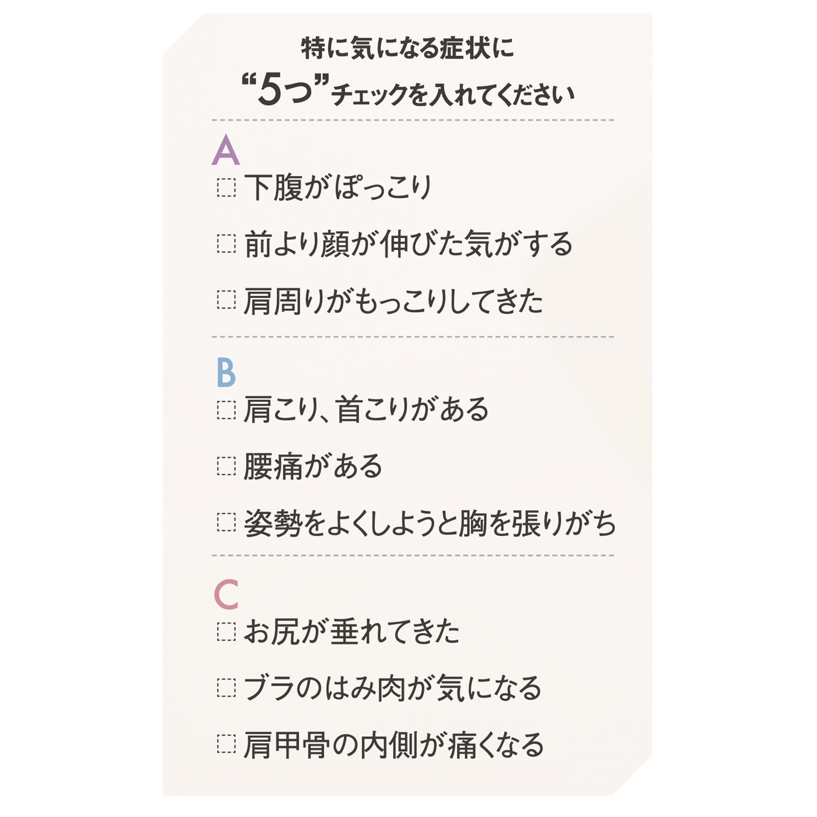 ゆるみパーツ診断チェックリストであなたのタイプが判明!特に気になる症状に5つチェックを入れるだけで、強化すべきパーツがわかります。