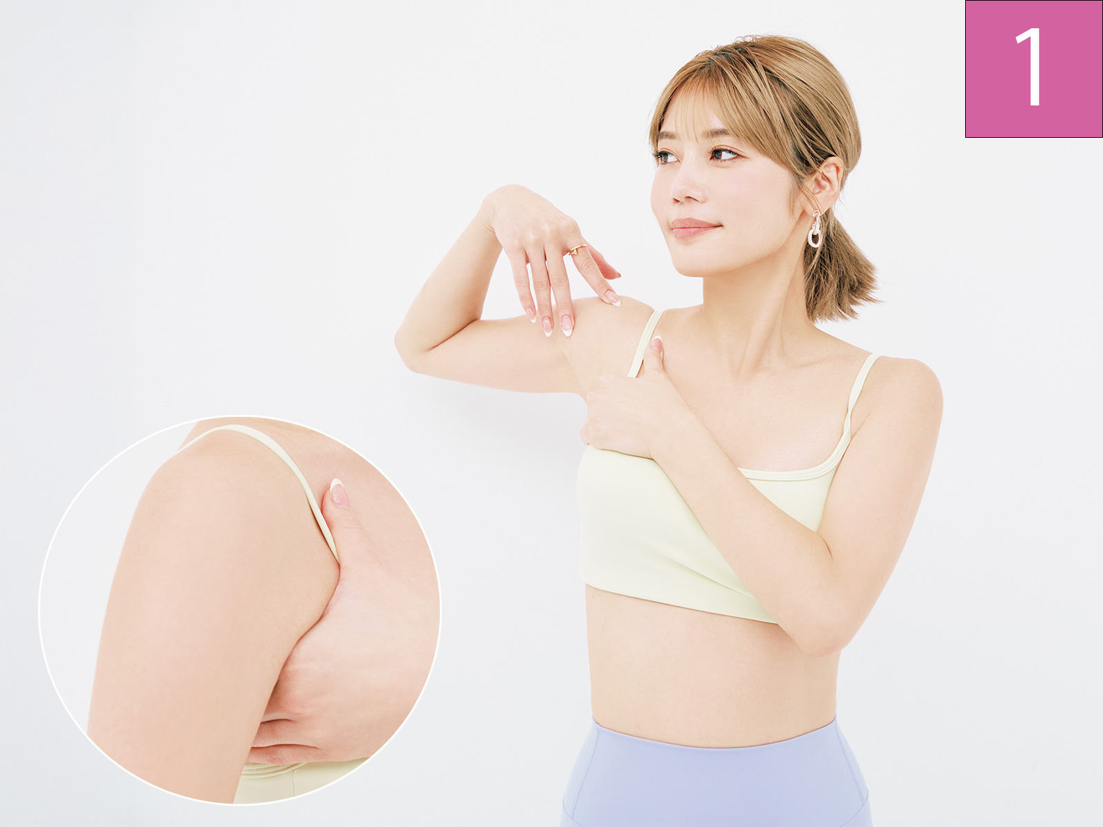 親指で鎖骨を、残りの4本の指で脇の肉を摘み上げます。そのまま腕を回し、肩周りの筋肉をほぐします。