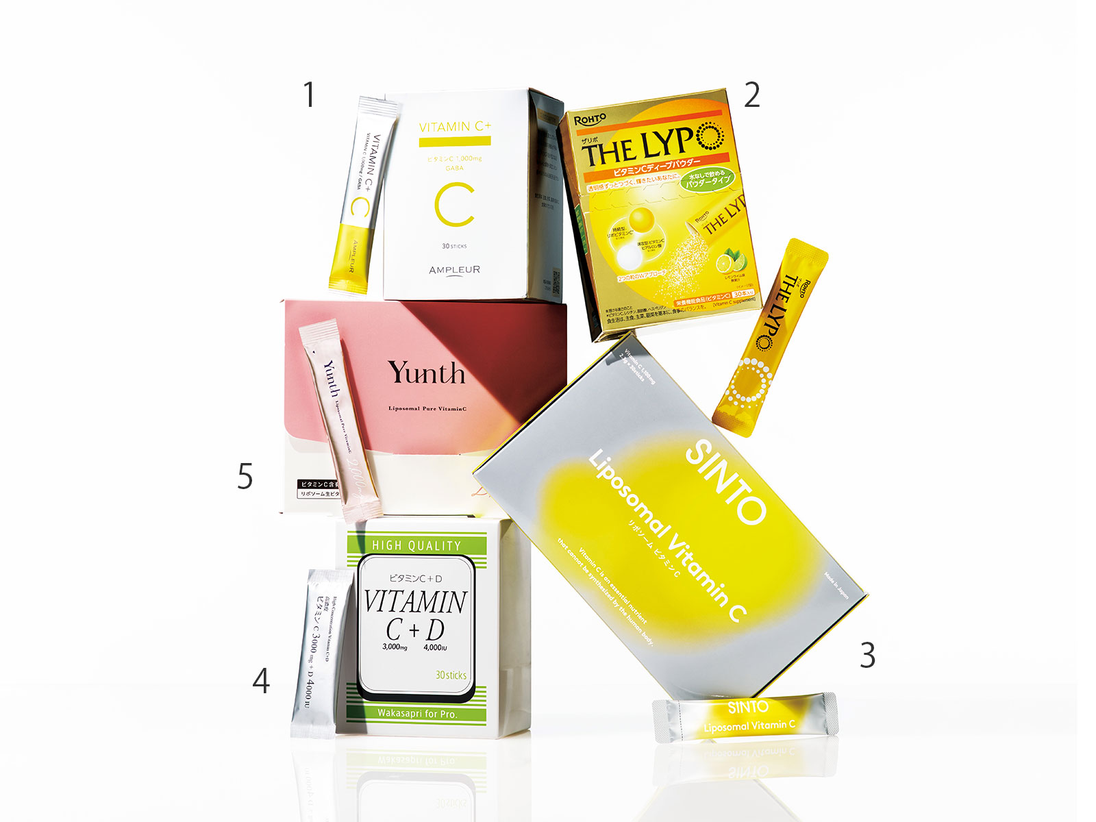 「すぐに血中濃度のピークを作りつつ、リポソームで長く。日中に紫外線を浴びる人は、朝に吸収率の良い生ビタミンを」レチノールも配合し、エイジングケアにアプローチ。Yunth リポソーム生ビタミンC 2.5g×28包 ¥3,960(Yunth)