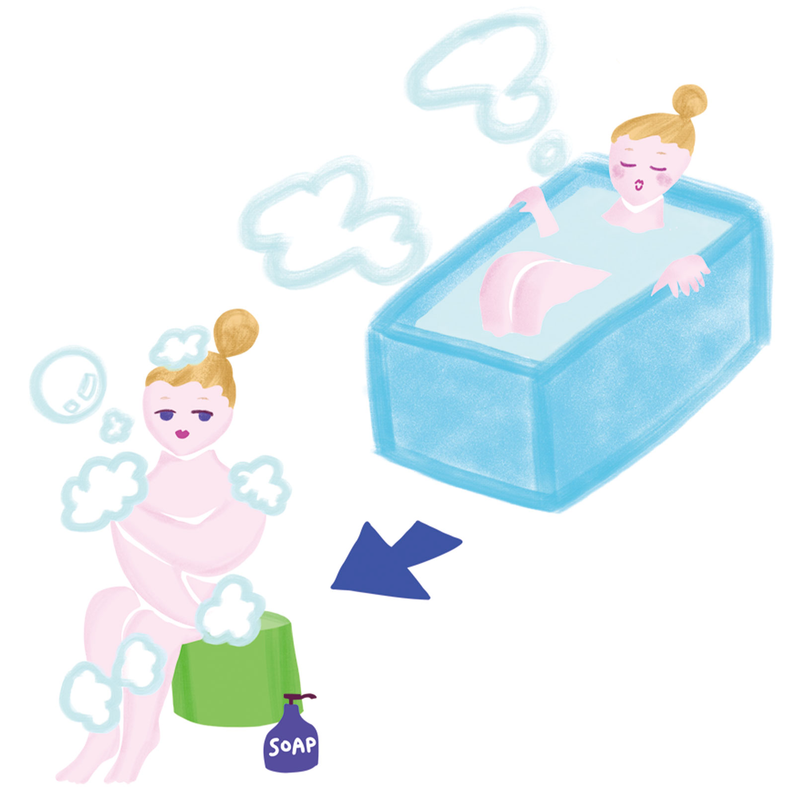再度全身浴を2分ほどしたら、体や髪を洗いましょう。冷水をかけた後だと体が冷えてしまうので注意しましょう。全身浴した後は皮膚も柔らかくなっているため余分な角質も落としやすいです。