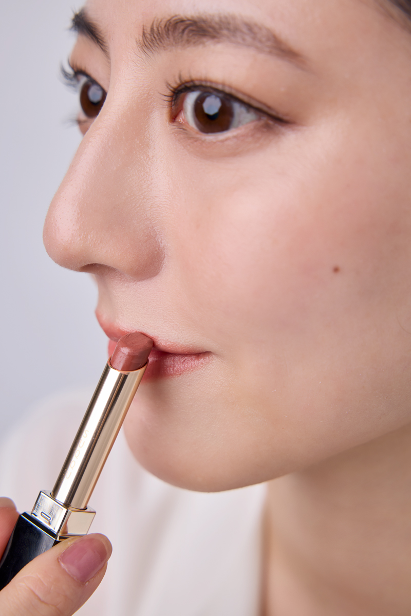 ツヤ感のある肌にはリップの色味を少し抑えることで全体のバランスが整います。くすみのあるベージュピンクやブラウンピンクだと肌馴染みもよくベスト。マットタイプよりも、縦ジワを強調せずほどよいツヤ感を与えてくれるセミマットがオススメ。全体に1mmほどオーバーリップめに塗れば唇のしぼみもカバー。スティックの背の部分を使うと綺麗にオーバーリップが可能に。