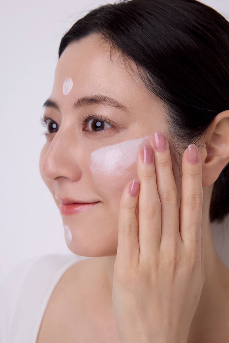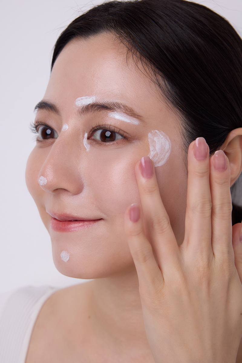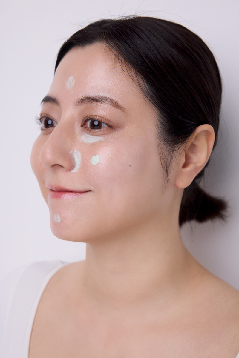 頑固な赤みが出やすいポイントにのみグリーン系の下地をさらにプラス。額、顎、小鼻、両頬、そしてクマが気になる方は目の下にもオン。伸ばすのではなくタッピングで馴染ませて。