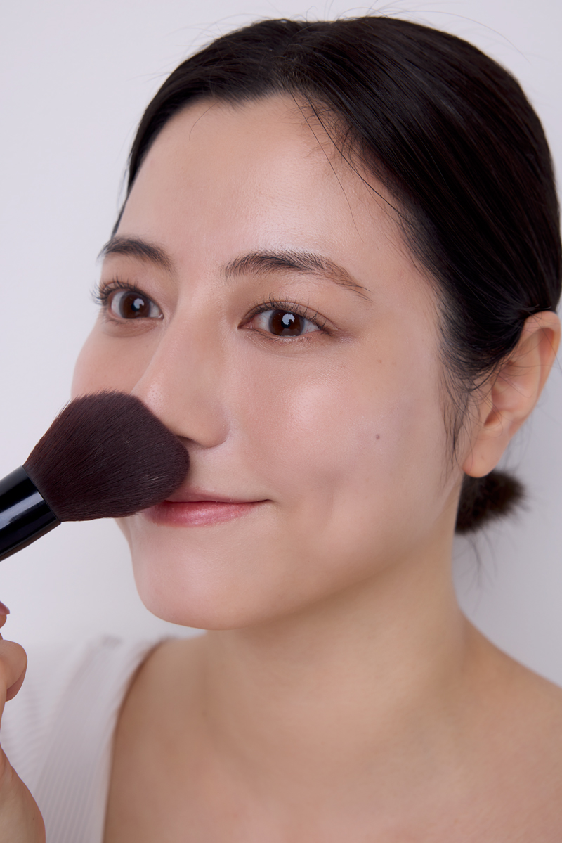 パウダーは、下地で仕込んだローズカラーと相性の良いベージュ系を選ぶのが正解。全体のスキントーンが整い、より抜け感と品のある表情が叶います。お手持ちのパウダーブラシにパウダーを含ませ、顔の中心から外側に向けてサッサッと。パフよりもブラシを使うとツヤが出て、毛穴落ちもしにくいのでオススメです。忘れがちな鼻の下もしっかりパウダーを。ここがテカると途端にだらしない印象になるので要注意。