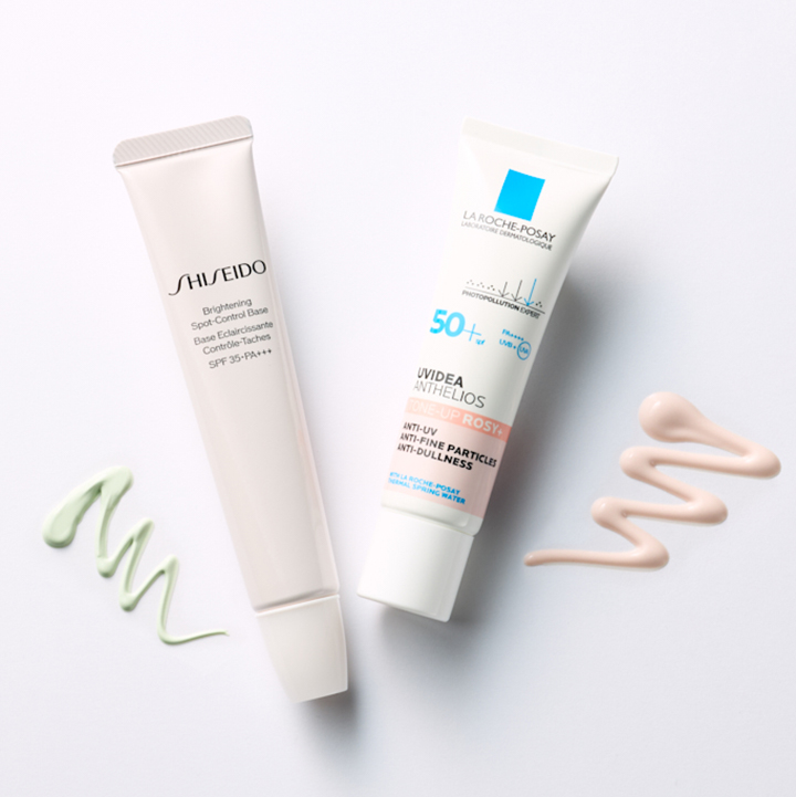 右:光を乱反射し肌を綺麗に見せるトーンアップUV。国内最高値の紫外線防御効果を発揮しながら、独自のスキンケア膜が肌をなめらかに整え、明るくつるんとした肌印象に。UVイデア XL プロテクショントーンアップ ローズ+ SPF50+ PA++++ 30㎖ ¥3,960 (ラ ロッシュ ポゼ) 左:気になるシミや色ムラをカバー。赤みを抑えるグリーンはスポット使いにも◎。紫外線やほこりなどの外的刺激からも肌を守り、ブランドの叡智の結集とも言える美白成分を配合し、日中ダメージによるシミやそばかすからも肌をプロテクト。ブライトニング スポットコントロール ベース グリーン 32g ¥5,500 [医薬部外品](SHISEIDO)