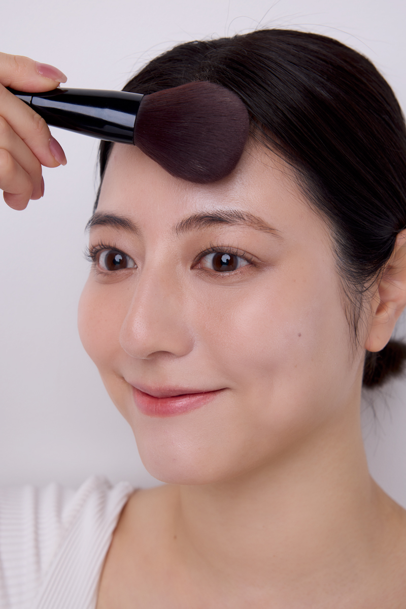 テカリ防止のためにも、額全体にしっかりパウダーをオン。ブラシで磨くようなイメージでのせると◎。眉とまぶたにもしっかりのせておくと、その後のメークのりが段違いに良くなり、かつ崩れにくくなるという嬉しい効果も。