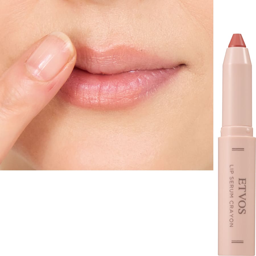口まわりが痩せてくる大人の唇は、山の部分と下唇の中央を少しオーバー気味に描くのがコツ。塗りやすいクレヨンタイプのオレンジ系でラインを引いたら、指でトントンと軽く馴染ませます。痩せた唇に自然なボリュームが生まれ、人中が短く見える効果も。オーバー気味に塗ることで、唇のふっくら感が際立ってバランスよく整います。塗るたびうるおい、くすみや縦ジワもさりげなくカバーできるセミマット。リップセラムクレヨン オレンジテンポ ¥3,300(エトヴォス)※数量限定