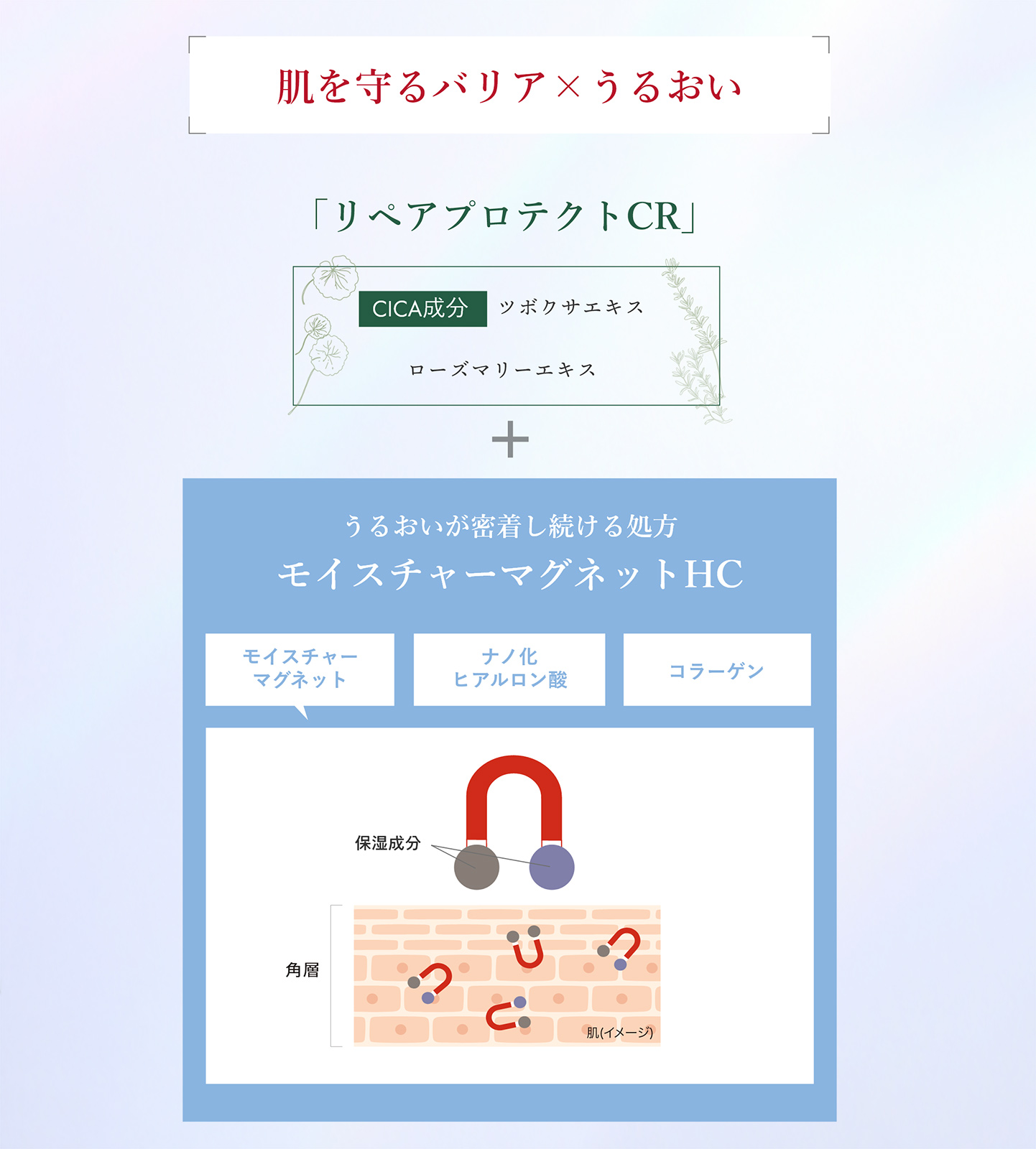肌を鎮静させるツボクサエキスと、肌のうるおいをもたらすローズマリーエキスを配合。肌の治安を守る処方に。そして肌に磁石のようにうるおいが密着する独自のモイスチャーマグネットHC処方で、長時間しっとりとツヤのある肌印象に。