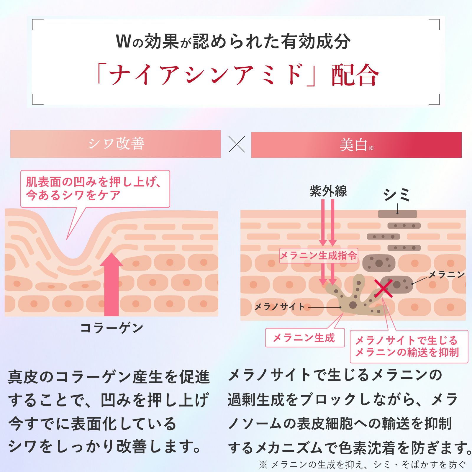 大人肌の悩みの上位にランクインするシワやシミ……。そのお悩みツートップにWの効果が実証されているスター成分、ナイアシンアミドを配合。手間いらずで美肌に仕上げ、メイクしている間もお悩みケアを可能に。毎日使用する度に理想的な美肌に近づける実感がある、プチプライスなのに頼もしい存在です!