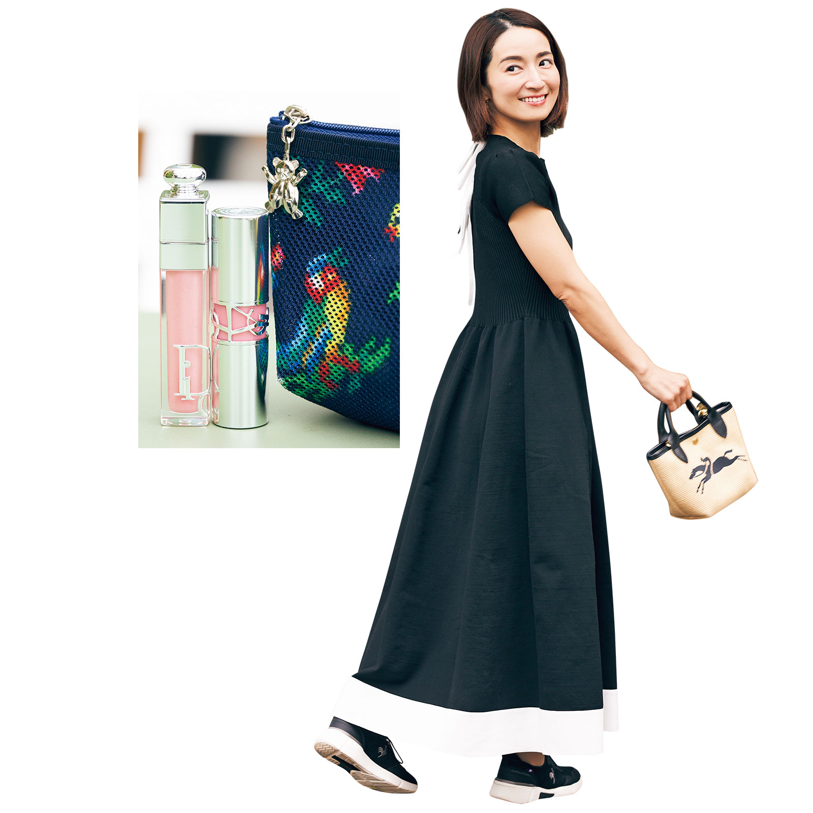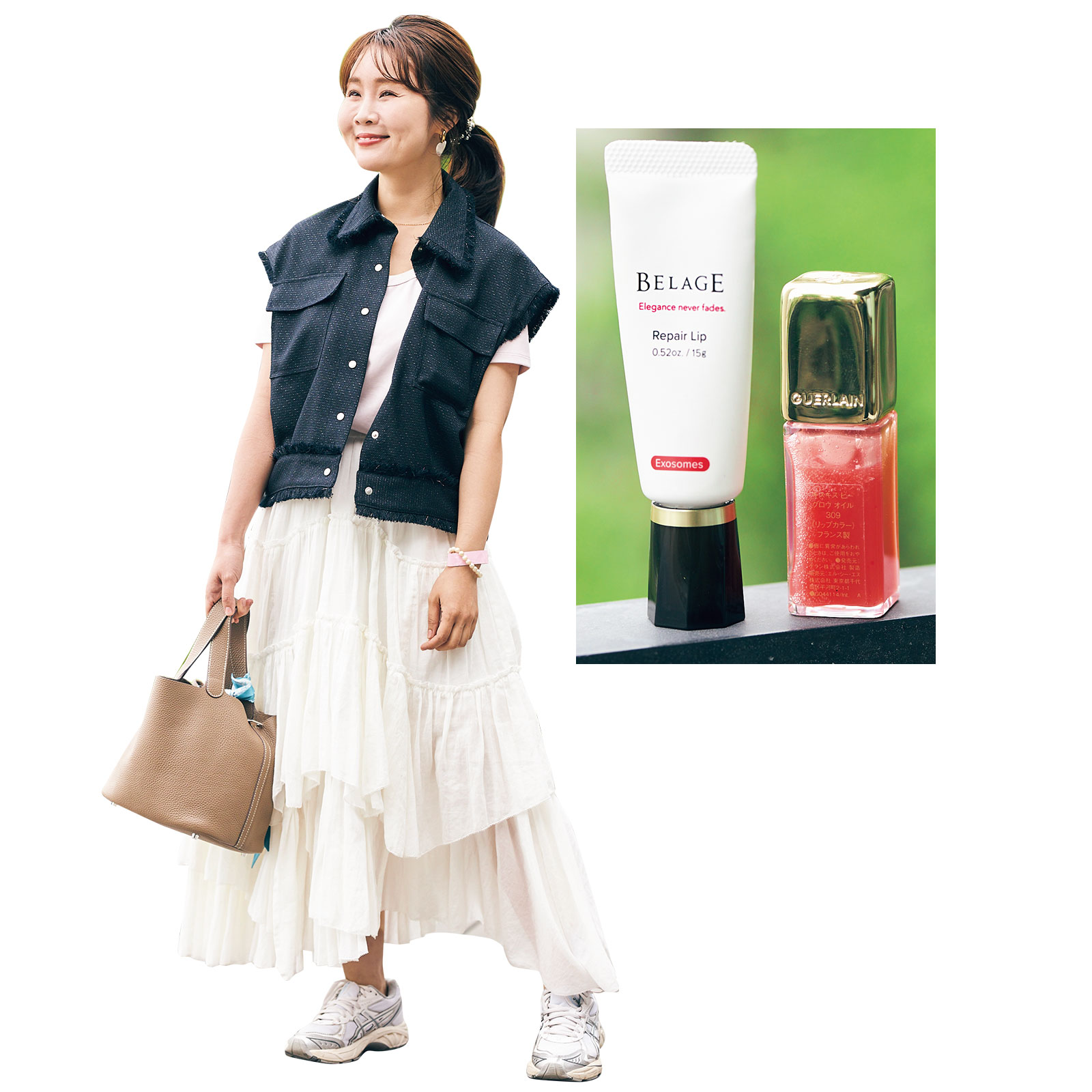 クールなシンプルメイクが好みだから、肌も目元も作り込まず、色もナチュラルカラーを選んでいます。唇に色がないと不健康に見えるので、エクセル リップナイズド LN 04を薄く塗って血色感を演出。透け感のあるローズピンクのツヤが長時間持続してくれます。
