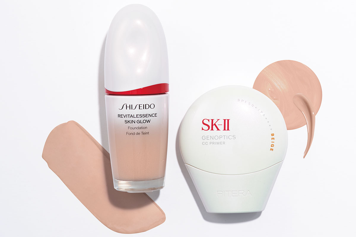 右:上品で自然なトーンアップが叶い、毛穴やくすみも綺麗に見せて長持ち。つけている間ずっとスキンケアできる安心感も良い。ジェノプティクス CC プライマー ナチュラルベージュ SPF50+・PA++++ 30g ¥9,900〈編集部調べ〉(SK-II)