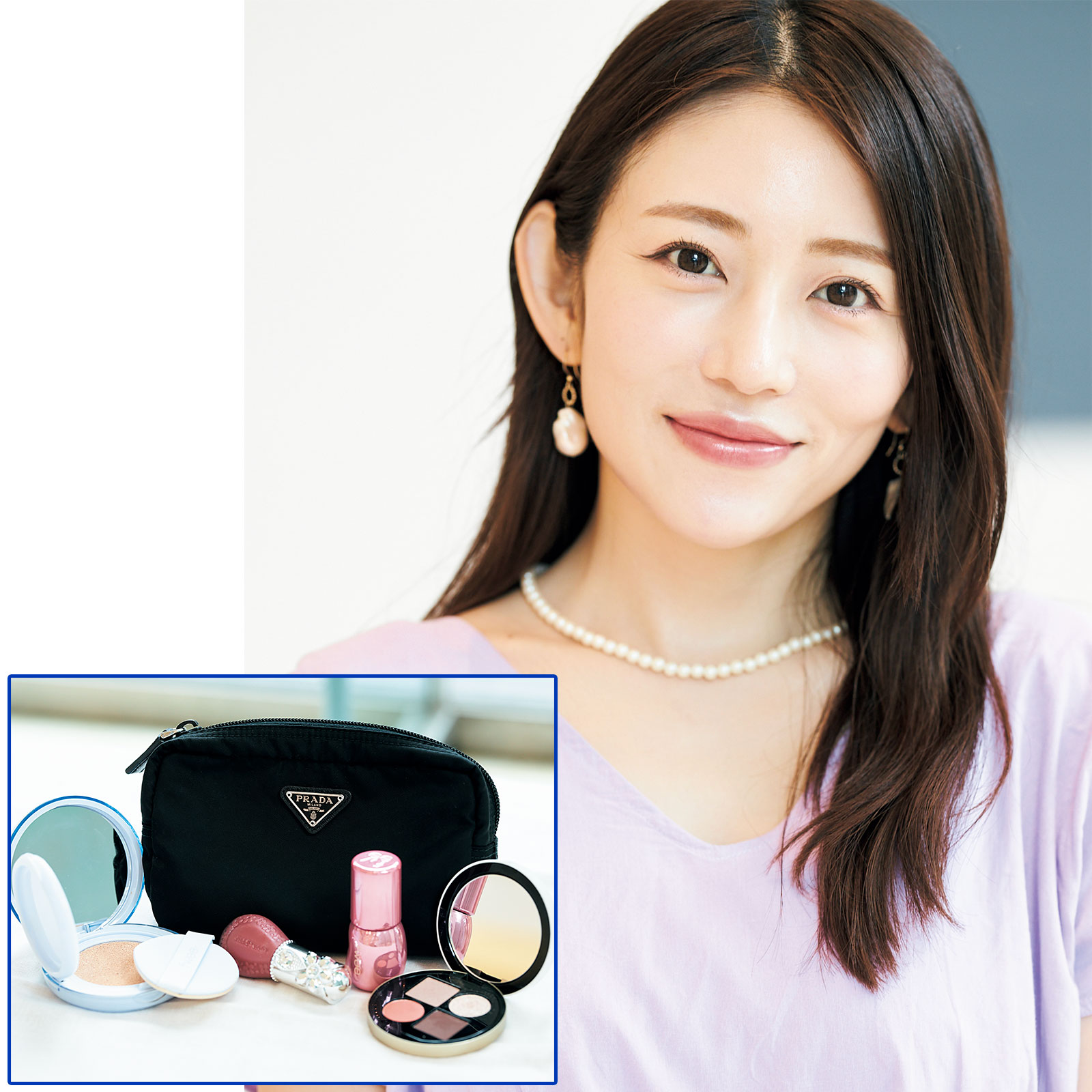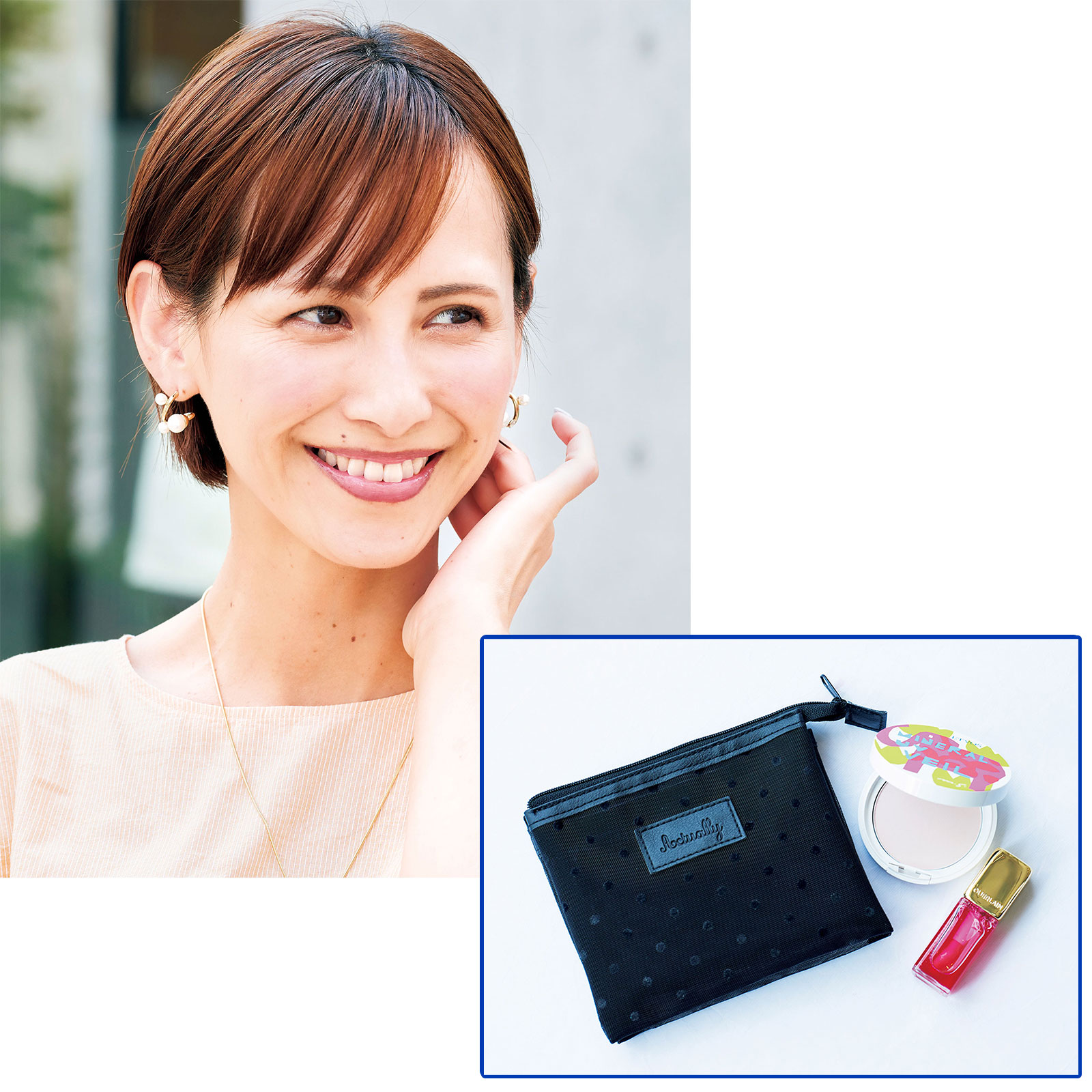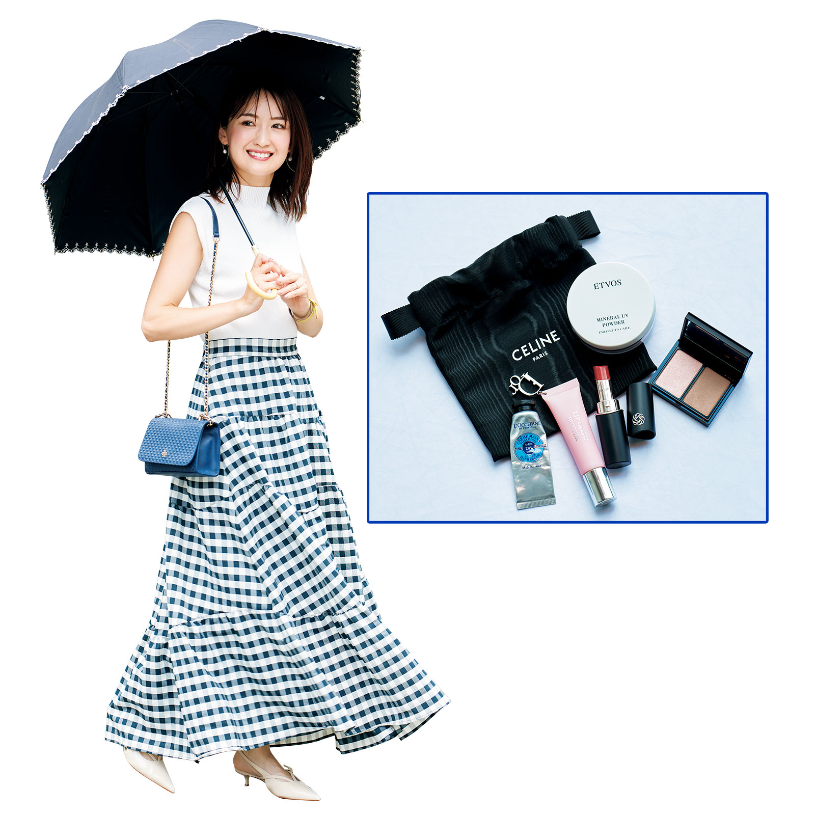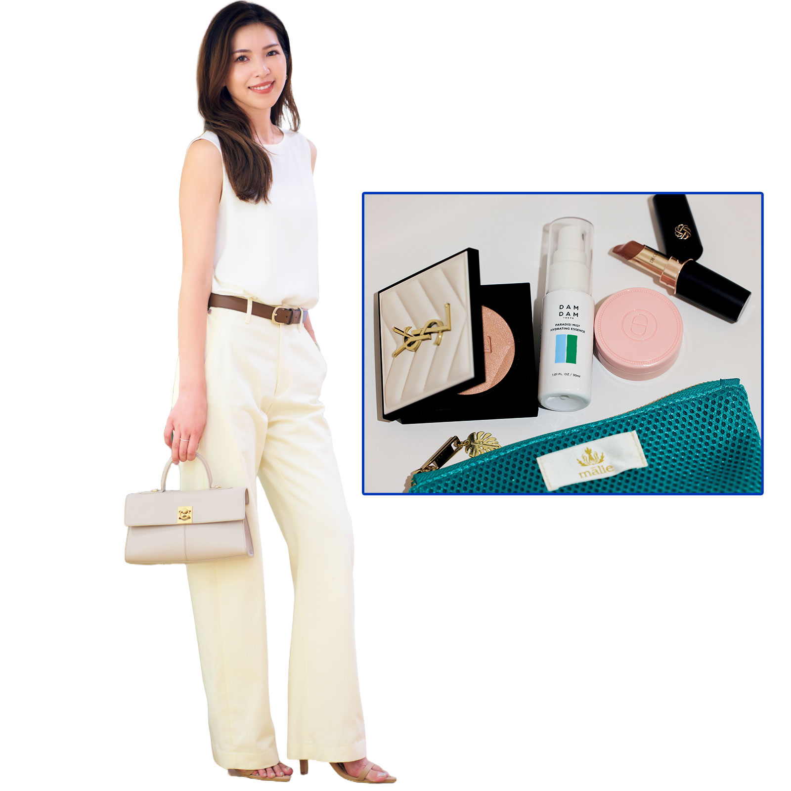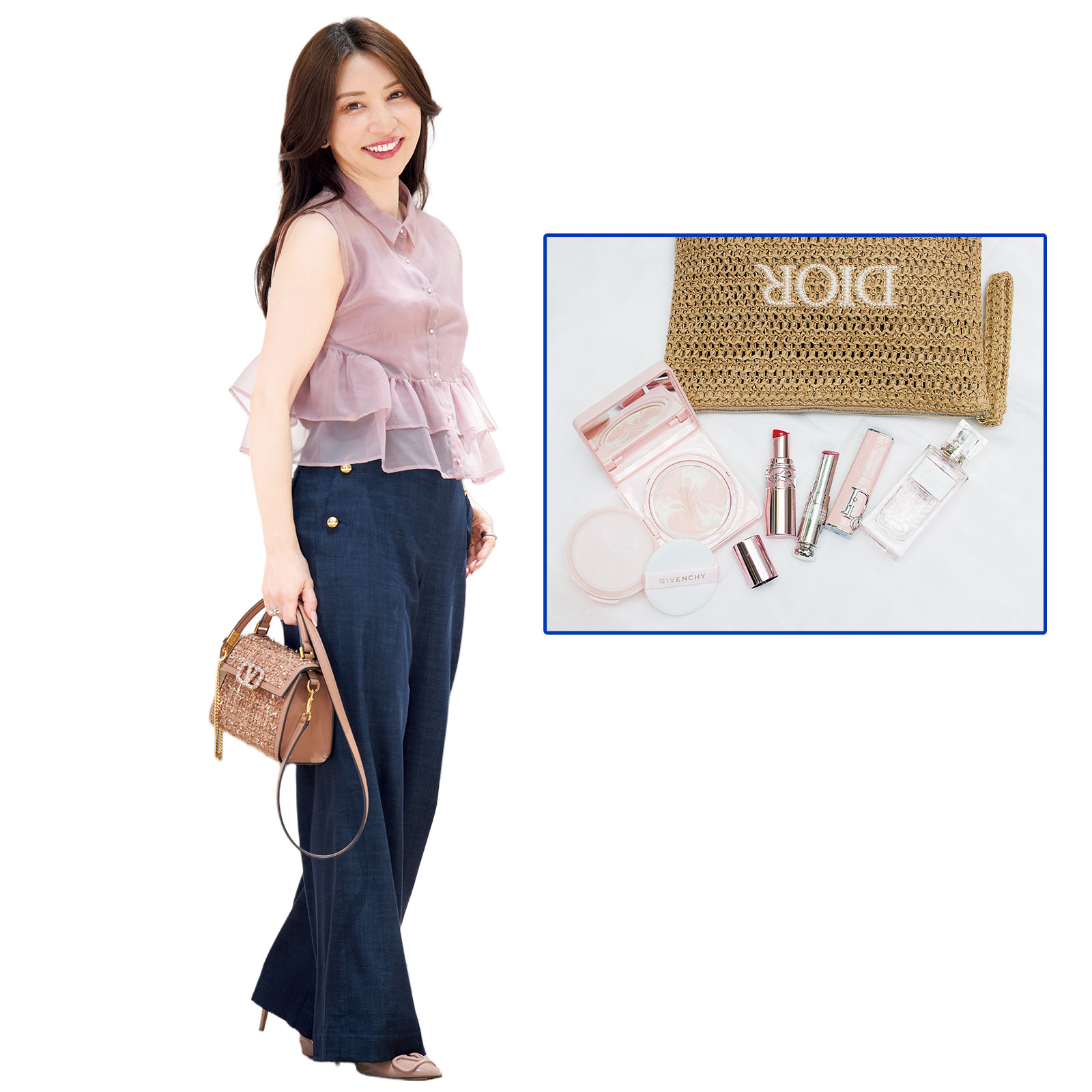 夏が大好きだから夏メイクも得意。YSLのハイパールミナイザー03の血色ピンクをTゾーン&頰に仕込んで輝くツヤ肌に。コスデコリップは赤みが少ないブラウンベージュ09でヘルシー仕上げ。ディオールのクレーム アブリコは足先のケア用に、DAMDAMミストは保湿に◎。