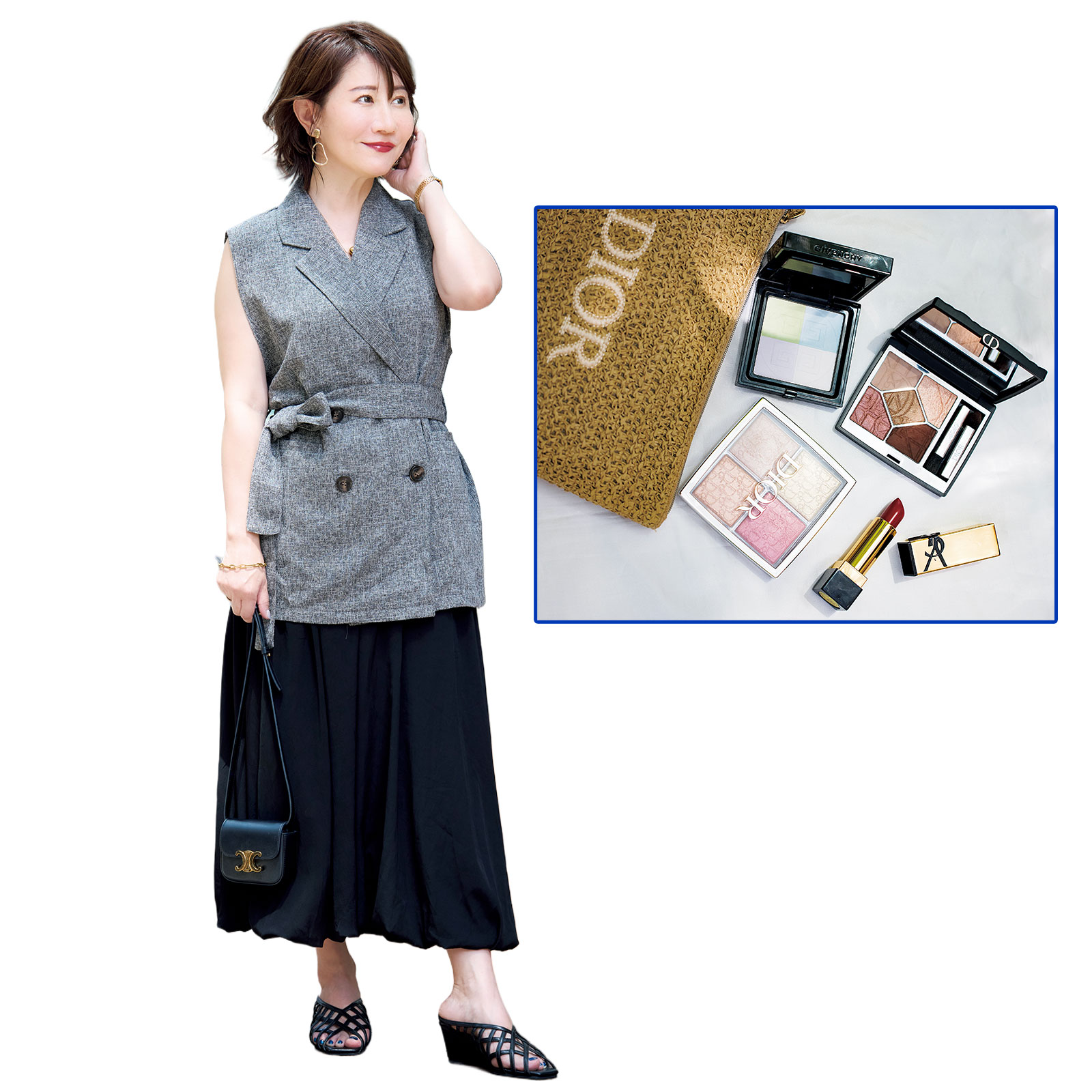 敏感肌で特に夏は顔が火照って赤みが目立ってしまうので、ジバンシイ プリズム・リーブル・プレストパウダー01で肌悩みをカバー。ふんわりのせると肌に透明感が出て、清潔感も生まれます。ピンクベージュのディオールショウ サンク クルール647で大人可愛い目元に。