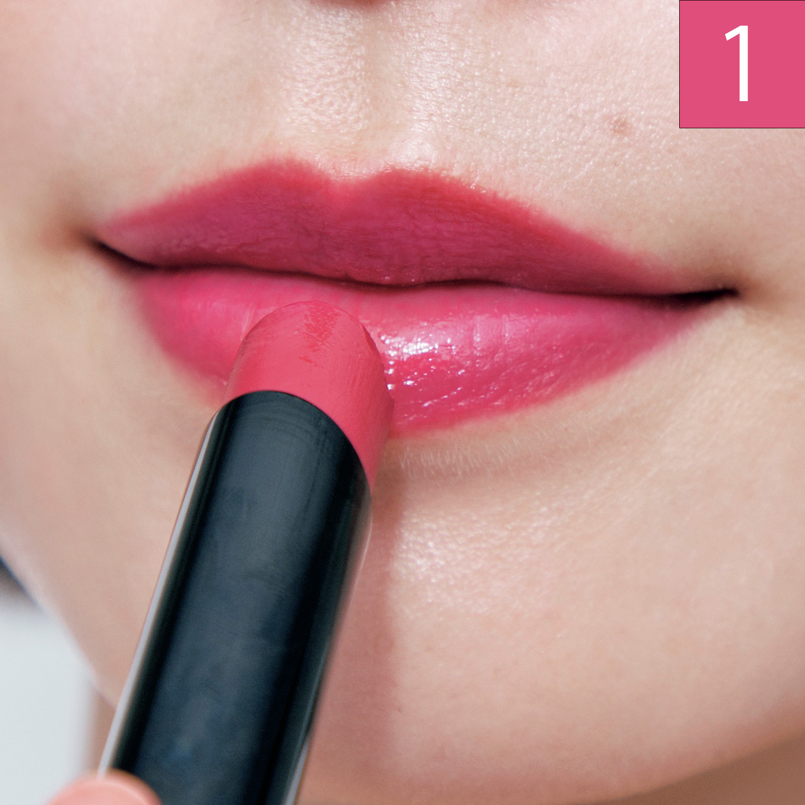 事前にリップクリームで保湿し皮剥けはオフ。その後リップを唇の輪郭どおりに、直塗りで塗り込みます。