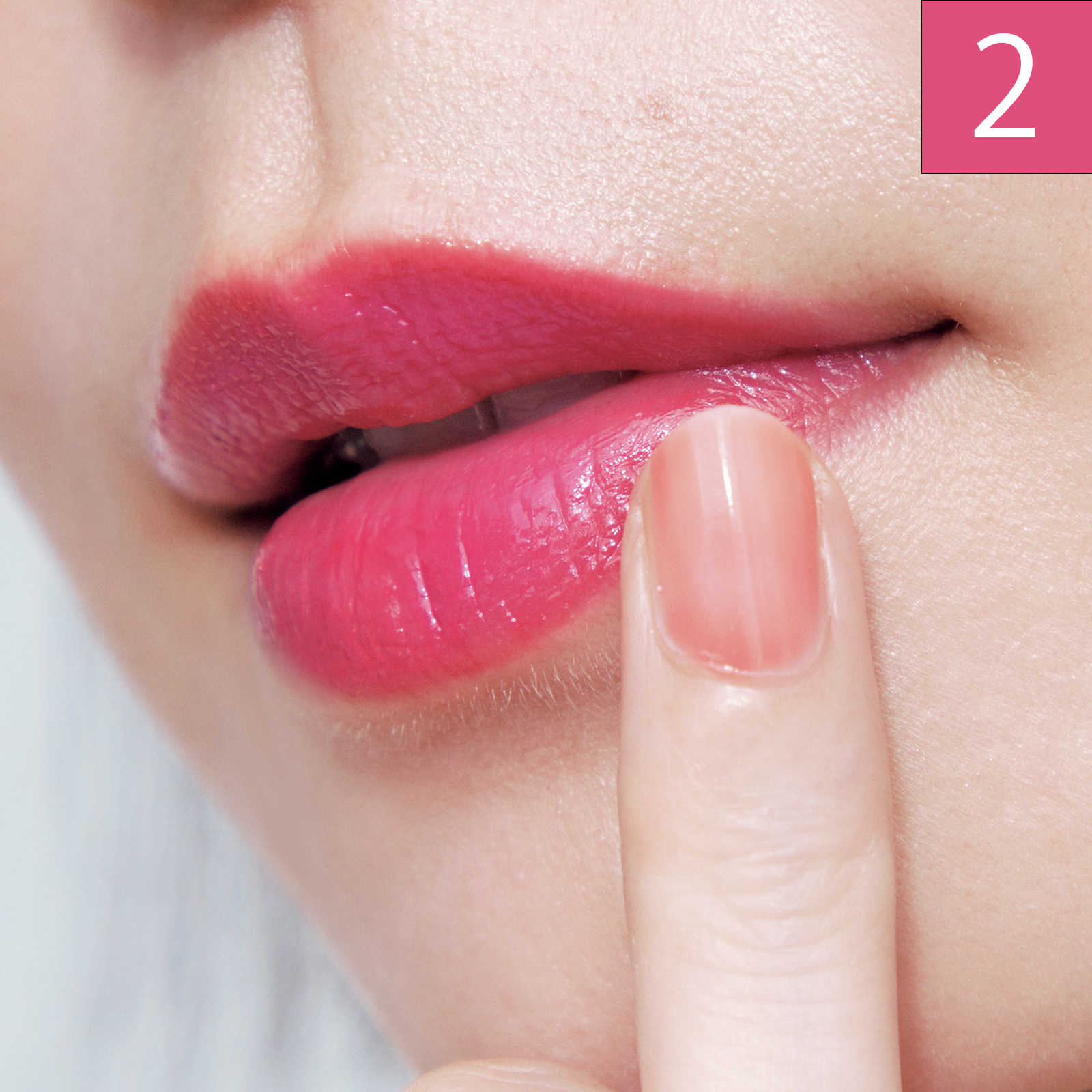 塗った輪郭をぼかすように指でポンポンと馴染ませます。こなれ感と抜け感が出て、濃いリップも若見え。
