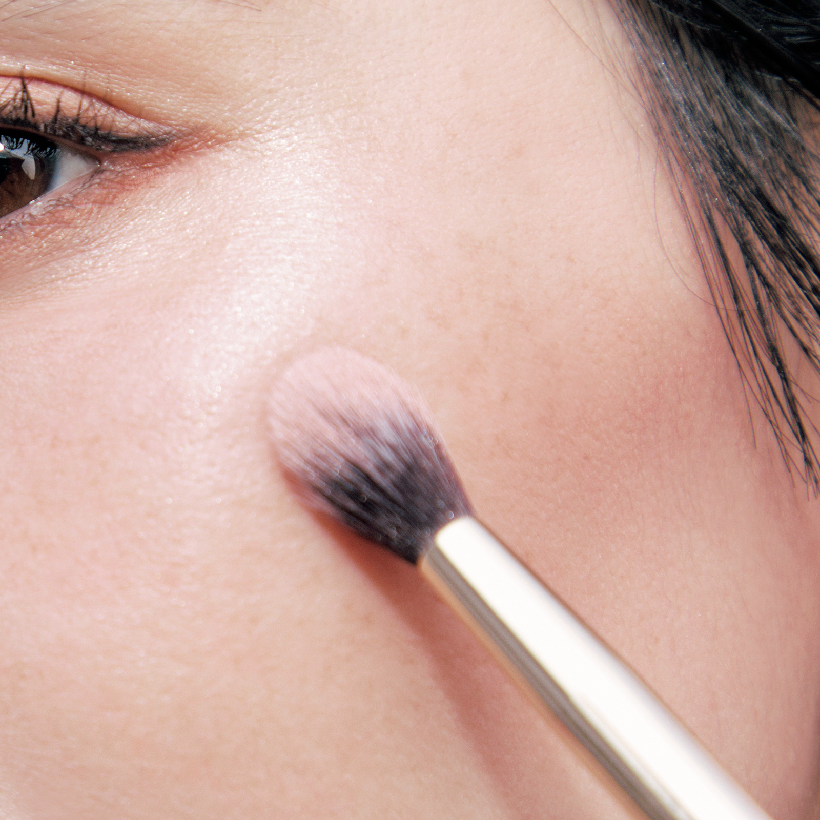 ブラシにハイライトを取り、頰の高い部分にひとはけ。彩やかなリップが浮かない明るくメリハリある肌トーンに。