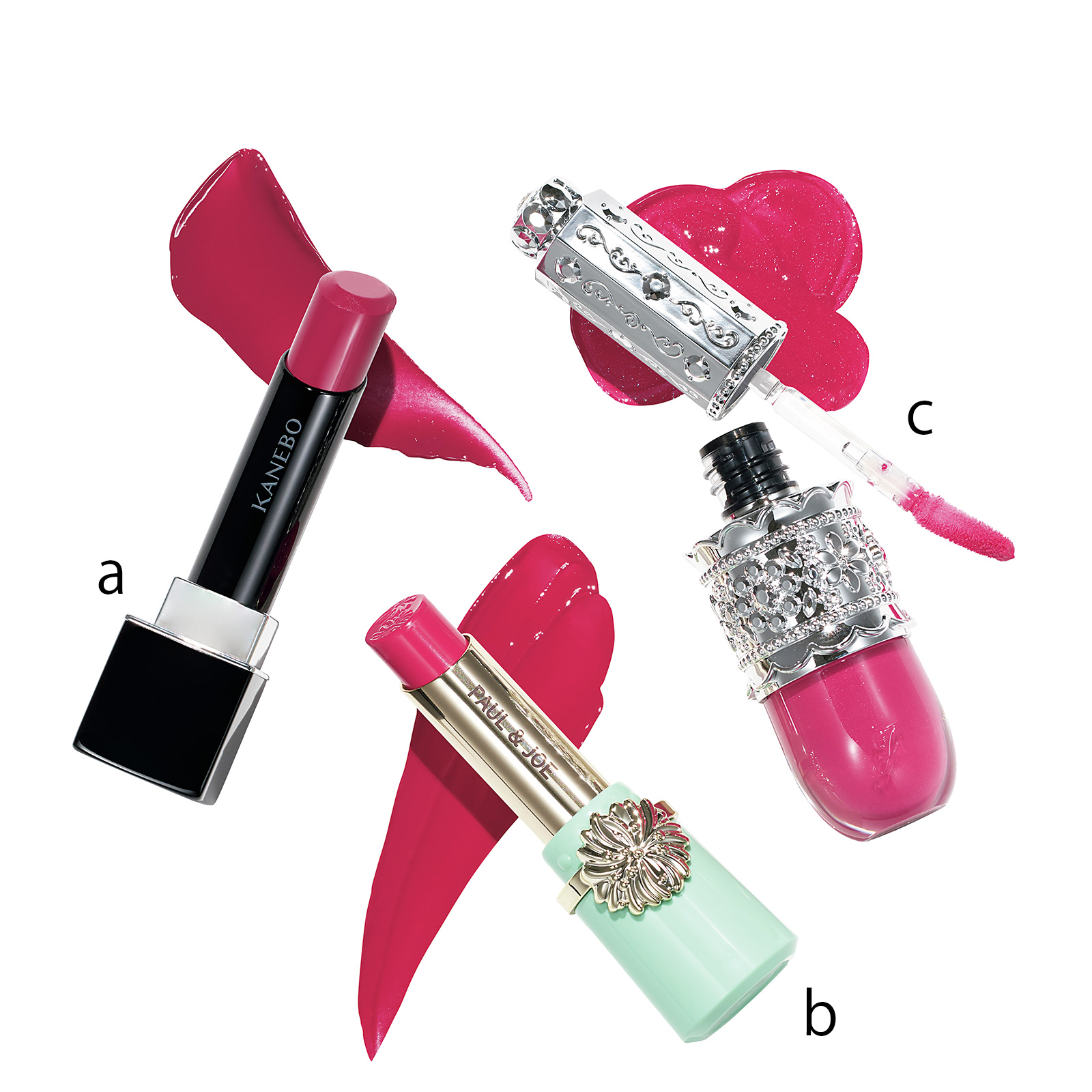 a.うるおい続く美容液ルージュ。高揚感のあるローズカラー。¥4,620(カネボウインターナショナル Div.)b.ひと塗りで高発色。鮮やかなフューシャピンク。 ¥3,300(セット価格)(ポール & ジョー ボーテ) c.ツヤやかでピュア印象の青みピンク。※限定色 ¥3,740(ジルスチュアートビューティ)