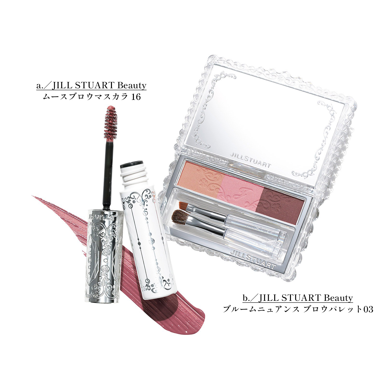 a. ピンクニュアンスで垢抜けた眉印象へ。¥2,420(ジルスチュアート ビューティ)b. 自然なエアリー眉を叶えるピンクブラウン。¥3,850(ジルスチュアート ビューティ)