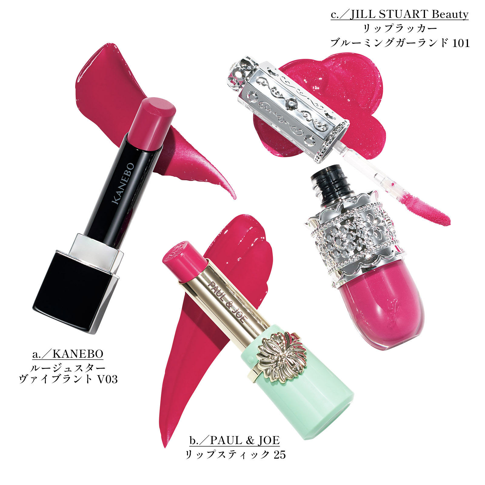 a. 【使用アイテム】うるおい続く美容液ルージュ。高揚感のあるローズカラー。¥4,620(カネボウインターナショナルDiv.) b. ひと塗りで高発色。鮮やかなフューシャピンク。 ¥3,300(セット価格)(ポール & ジョー ボーテ)c. ツヤやかでピュア印象の青みピンク。※限定色¥3,740(ジルスチュアート ビューティ)